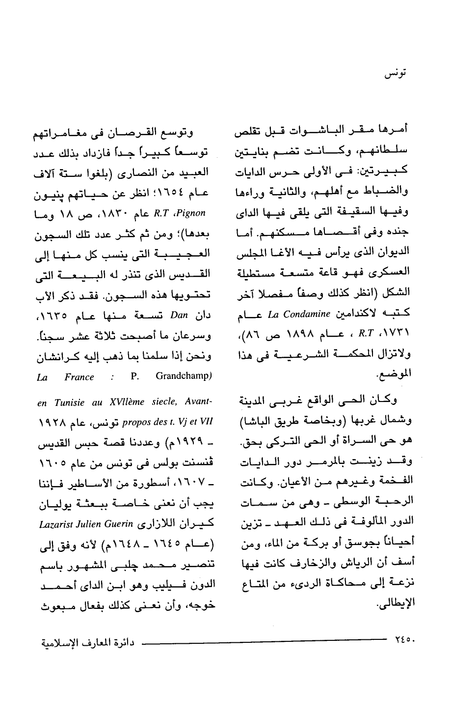 وتوسع القرصان في مغاماتهم توسعا كبير، جدًّا فازداد بذلك عدد العبيد من النصارى (بلغوا ستة آلاف عام 1654؛ انظر عن حياتهم ينيون R.T , Pignon عام. 11830، ص 18 وما بعدها)؛ ومن ثم أكثر عدد تلكُ السجون العجيبة التي ينسب كل منها إلى القديس الذي تنذر له البيعة التي تحتويها هذه السجون. فقد ذكر الأب دان Dan تسعة منها عام 1635 وسرعان ما أصبحت ثلاثة عشر سجنا. ونحن إذا سلمنا بما ذهب إليه كرانشان (La France: P. Grandchamp -en Tunisie au XVlleme siecle, Avant]et VI . propos des , تونس، 11928 - 1929) وعددنا قصة حبس القديس فنسنت بولس في تونس من عام 1605 - 1607، أسطورة من الأساطير فإننا يجب أن نعنى خاصة ببعثة يوليان كيرالن اللازاى- Lazarist Julien Guerin L 5 (عام 1645 - 1648) لأنه وفق إلى تنصير محمد جلبى المشهور باسم الدون فيليب وهو ابن الداى أحمد خوجه، وأن نعنى كذلك بفعال مبعوث