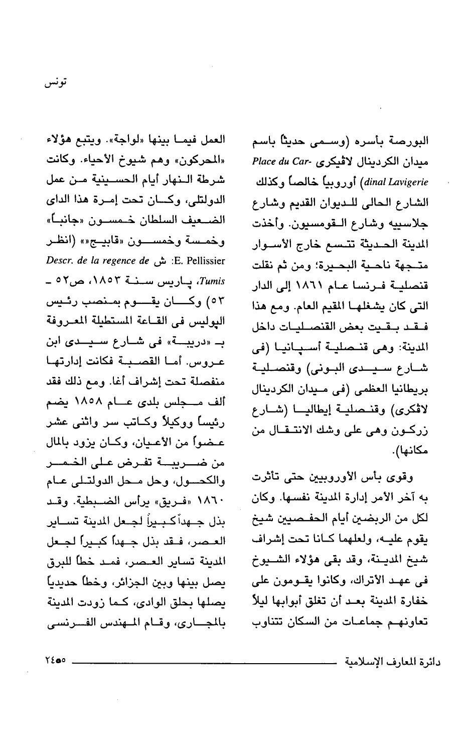 البورصة بأسره (وسمى حديثًا باسم ميدان الكردينال لافيكرى - Place du Car dinal Lavigerie) أوروبيا خالصا وكذلك الشارع الحالي للديوان القديم وشارع جلاسييه وشارع القومسيون. وأخذت المدينة الحديثة تتسع خارج الأسوار متجهة ناحية البحيرة؛ ومن ثم نقلت قنصلية فرنسا عام 1861 إلى الدار التي كان يشغلها المقيم العام. ومع هذا فقد بقيت بعض القنصليات داخل المدينة: وهي قنصلية أسبانيا (في شارع سيدى البونى) وقنصلية بريطانيا العظمى (في ميدان الكردينال لافكرى) وقنصلية إيطاليا (شارع زركون وهي على وشك الانتقال من مكانها).