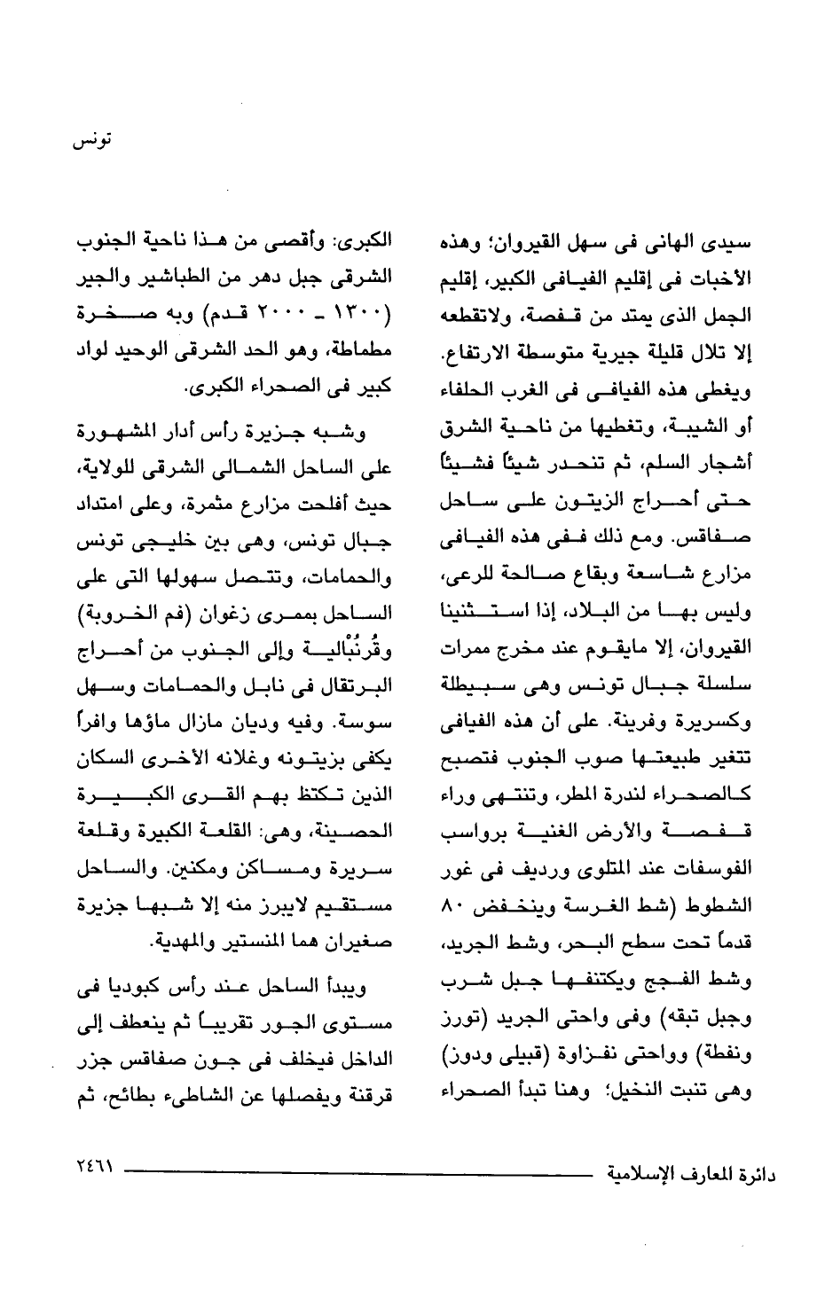 سيدى الهانى في سهل القيروان؛ وهذه الأخبات في إقليم الفيافى الكبير، إقليم الجمل الذي يمتد من قفصة، ولاتقطعه إلا تلال قليلة جيرية متوسطة الارتفاع. ويغطى هذه الفيافى في الغرب الحلفاء أو الشيبة، وتغطيها من ناحية الشرق أشجار السلم، ثم تنحدر شيئًا فشيئا حتى أحراج الزيتون على ساحل صفاقس. ومع ذلك ففي هذه الفيافى مزارع شاسعة وبقاع صالحة للرعى، وليس بها من البلاد، إذا استثنينا القيروان، إلا مايقوم عند مخرج ممرات سلسلة جبال تونس وهي سبيطلة وكسريرة وفرينة. على أن هذه الفيافى تتغير طبيعتها صوب الجنوب فتصبح كالصحراء لندرة المطر، وتنتهي وراء قفصة والأرض الغنية برواسب الفوسفات عند المتلوى ورديف في غور الشطوط (شط الغرسة وينخفض 80 قدما تحت سطح البحر، وشط الجريد، وشط الفجج ويكتنفها جبل شرب وجبل تبقه) وفي واحتى الجريد (تورز ونفطة) وواحتى نفزاوة (قبيلى ودوز) وهي تنبت النخيل؛ وهنا تبدأ الصحراء الكبرى: وأقصى من هذا ناحية الجنوب الشرقي جبل دهر من الطباشير والجير (1300 - 2000 قدم) وبه صخرة مطماطة، وهو الحد الشرقي الوحيد لواد كبير في الصحراء الكبرى.