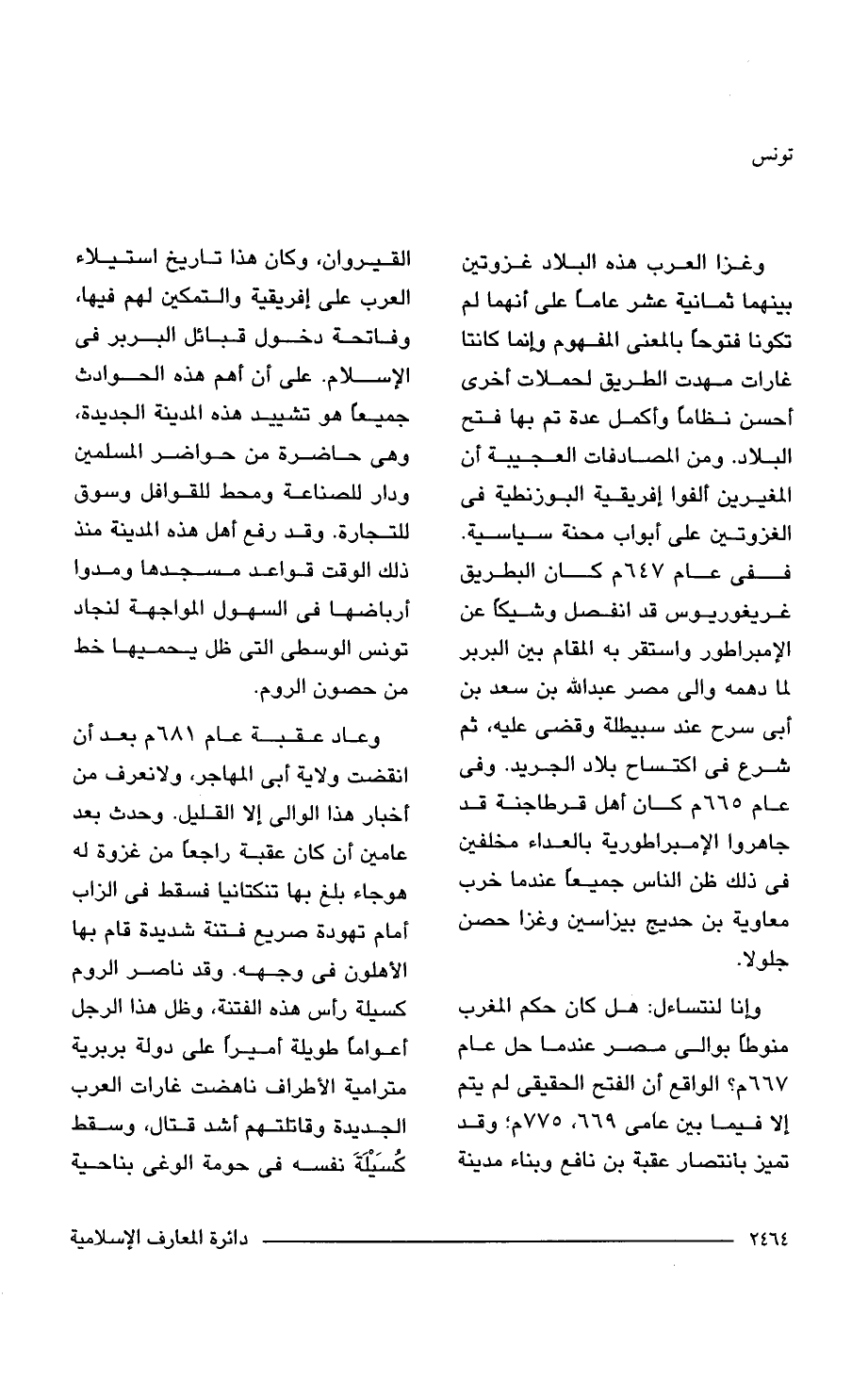 وغزا العرب هذه البلاد غزوتين بينهما ثمانية عشر عاما على أنهما لم تكونا فتوحًا بالمعنى المفهوم وإنما كانتا غارات مهدت الطريق لحملات أخرى أحسن نظاما وأكمل عدة تم بها فتح البلاد. ومن المصادفات العجيبة أن المغيرين ألفوا إفريقية البوزنطية في الغزوتين على أبواب محنة سياسية. ففي عام 647 م البطريق غريغوريوس قد انفصل وشيكا عن الإمبراطور واستقر به المقام بين البربر لما دهمه والى مصر عبد الله بن سعد بن أبي سرح عند سبيطلة وقضى عليه، ثم شرع في اكتساح بلاد الجريد. وفي عام 665 م كان أهل قرطاجنة قد جاهروا الإمبراطورية بالعداء مخلفين في ذلك ظن الناس جميعًا عندما خرب معاوية بن حديج بيزاسين وغزا حصن جلولا وإنا لنتساءل: هل كان حكم المغرب منوطًا بوالى مصر عندما حل عام 667 م؟ الواقع أن الفتح الحقيقي لم يتم إلا فيما بين. 669، 775 م؛ وقد تميز بانتصار عقبة بن نافع وبناء مدينة القيروان، وكان هذا تاريخ استيلاء العرب على إفريقية والتمكين لهم فيها، وفاتحة دخول قبائل البربر في الإسلام. على أن أهم هذه الحوادث جميعًا هو تشييد هذه المدينة الجديدة، وهي حاضرة من حواضر المسلمين ودار للصناعة ومحط للقوافل وسوق للتجارة. وقد رفع أهل هذه المدينة منذ ذلك الوقت قواعد مسجدها ومدوا أرباضها في السهول المواجهة لنجاد تونس الوسطى التي ظل يحميها خط من حصون الروم.