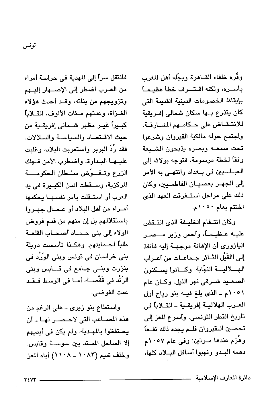 وكان انتقام الخليفة الذي انتقض عليه عظيما، وأحس وزير مصر اليازورى أن الاهانة موجهة إليه فأنفذ إلى االقَيل الثائر جماعات من أعراب الهلالية النهّابة، وكانوا يسكنون الصعيد شرقي نهر النيل. وكان عام 1051 م- الذي بلغ فيه بنو رياح أول العرب الهلالية إفريقية- انقلابًا في تاريخ القطر التونسى. وأسرع المعز إلى تحصين القيروان فلم يجده ذلك نفعًا وهزم عندها مرتين، وفي عام 1057 م دهمه البدو ونهبوا أسافل البلاد كلها، فانتقل سرًام إلى المهدية في حراسة أمراء من العرب اضطر إلى الإصهار إليهم وتزويجهم من بناته، وقد أحدث هؤلاء الغزاة، وعدتهم مئات الألوف، انقلابا كبيرًا غير مظهر شمالي إفريقية من حيث الاقتصاد والسياسة والسلالات. فقد رد البربر واستعربت البلاد، وغلبت عليها البداوة. واضطرب الأمن فهلك الزرع وتقوّض سلطان الحكومة المركزية، وسقطت المدن الكبيرة في يد العرب أو استقلت بأمر نفسها يحكمها أمراء من أهل البلاد أو عمال جهروا باستقلالهم بل إن منهم من قدم فروض الولاء إلى بنى حماد أصحاب القلعة طلبا لحمايتهم. وهكذا تأسست دويلة بنى خراسان في تونس وبنى الوَرد في بنزرت وبنى جامع في قابس وبنى الرَنْد في قَفْصة، أما في الوسط فقد عمت الفوضى.