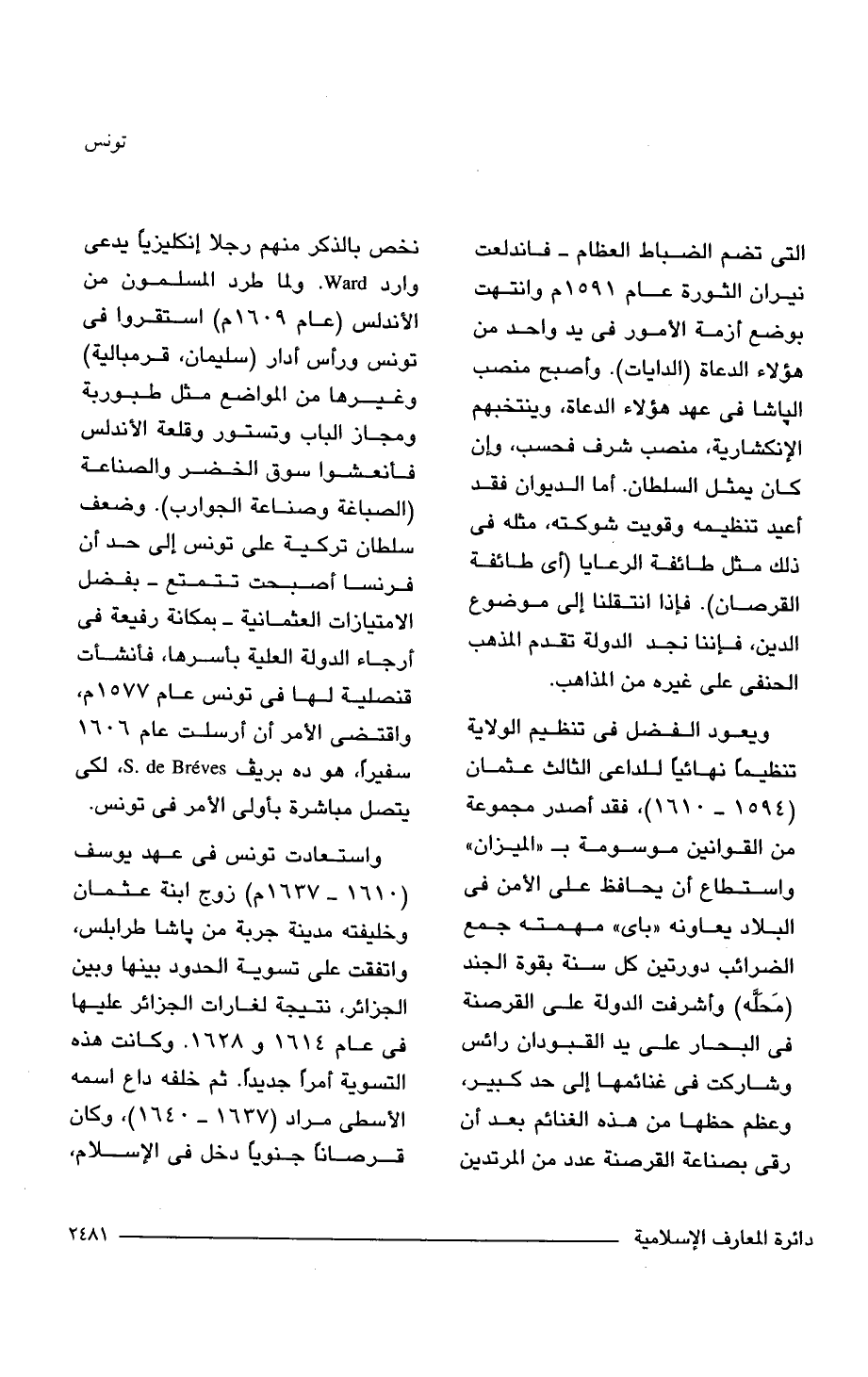 التي تضم الضباط العظام- فاندلعت نيران الثورة عام 1591 م وانتهت بوضع أزمة الأمور في يد واحد من هؤلاء الدعاة (الدايات). وأصبح منصب الياشا في عهد هؤلاء الدعاة، وينتخبهم الإنكشارية، منصب شرف فحسب، كان كان يمثل السلطان. أما الديوان فقد أعيد تنظيمه وقويت شوكته، مثله في ذلك مثل طائفة الرعايا (أي طائفة القرصان). فإذا انتقلنا إلى موضوع الدين، فإننا نجد الدولة تقدم المذهب الحنفي على غيره من المذاهب.