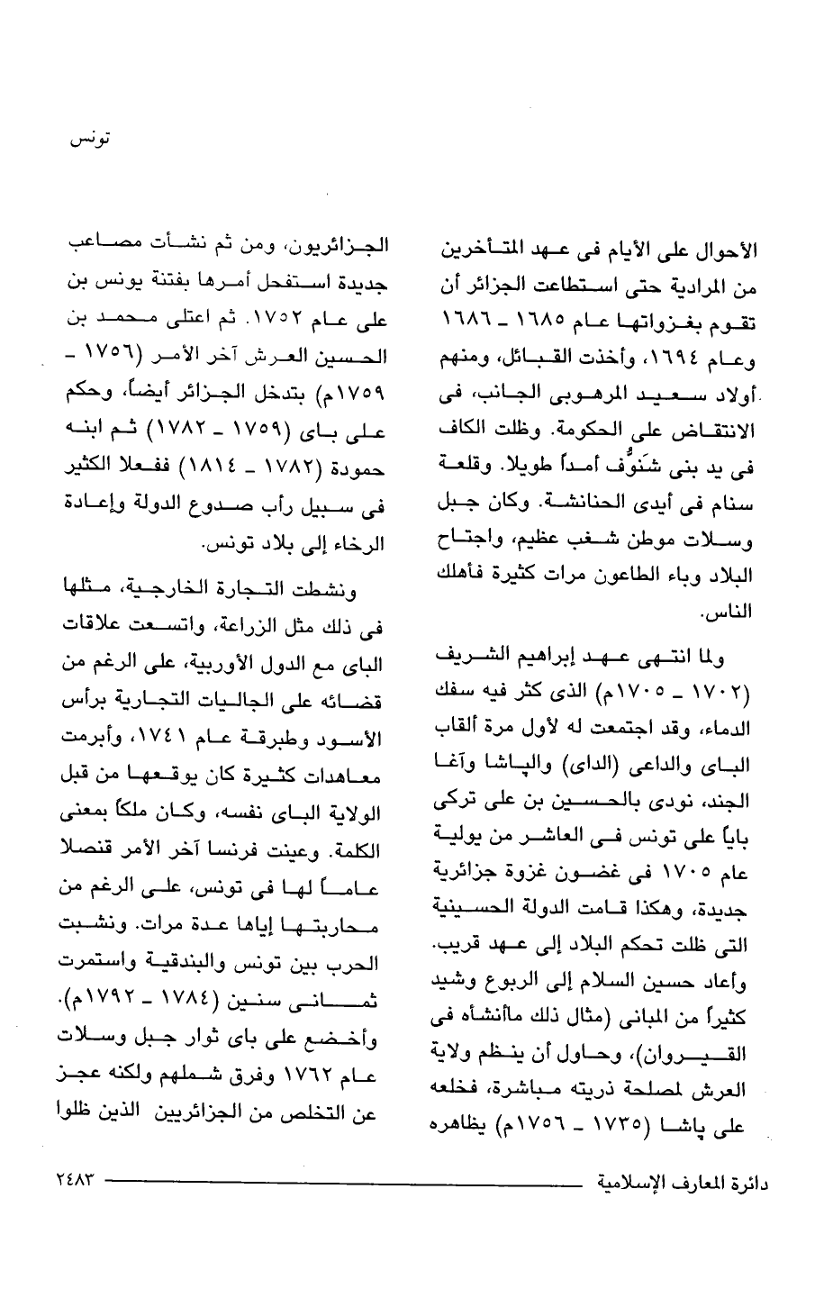 ولما انتهى عهد إبراهيم الشريف (1702 - 1705 م) الذي أكثر فيه سفك الدماء، وقد اجتمعت له لأول مرة ألقاب الباى والداعى (الداى) والباشا وآغا الجند، نودى بالحسين بن علي تركى بايا على تونس في العاشر من يولية عام 1705 في غضون غزوة جزائرية جديدة، وهكذا قامت الدولة الحسينية التي ظلت تحكم البلاد إلى عهد قريب. وأعاد حسين السلام إلى الربوع وشيد كثير، من المبانى (مثال ذلك ما أنشأه في القيروان)، وحاول أن ينظم ولاية العرش لمصلحة ذريته مباشرة، فخلعه على باشا (1735 - 1756 م) يظاهره الجزائريون، ومن ثم نشأت مصاعب جديدة استفحل أمرها بفتنة يونس بن على عام 1752. ثم اعتلى محمد بن الحسين العرش آخر الأمر (1756 - 1759 م) بتدخل الجزائر أيضًا، وحكم على باى (1759 - 1782) ثم ابنه حمودة (1759 - 1782) ففعلا الكثير في سبيل رأب صدوع الدولة وإعادة الرخاء إلى بلاد تونس.