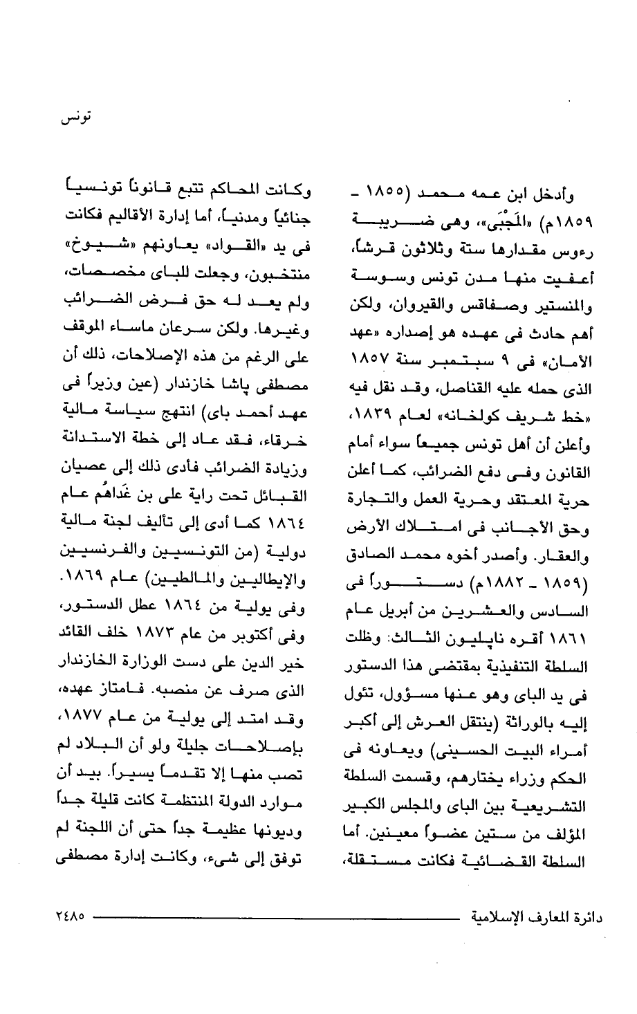 وأدخل ابن عمه محمد (1855 - 1859 م) "المَجْبَى"، وهي ضريبة رءوس مقدارها ستة وثلاثون قرشًا، أعفيت منها مدن تونس وسوسة والمنستير وصفاقس والقيروان، ولكن أهم حادث في عهده هو إصداره "عهد الأمان" في 9 سبتمبر سنة 1857 الذي حمله عليه القناصل، وقد نقل فيه "خط شريف كولخانه" لعام 1839 وأعلن أن أهل تونس جميعن سواء أمام القانون وفي دفع الضرائب، كما أعلن حرية المعتقد وحرية العمل والتجارة وحق الأجانب في امتلاكُ الأرض والعقار. وأصدر أخوه محمد الصادق (1859 - 1882) دستورًا في السادس والعشرين من أبريل عام 1861 أقره نايليون الثالث: وظلت السلطة التنفيذية بمقتضى هذا الدستور في يد الباى وهو عنها مسؤول، تئول إليه بالوراثة (ينتقل العرش إلى أكبر أمراء البيت الحسينى) ويعاونه في الحكم وزراء يختارهم، وقسمت السلطة التشريعية بين الباى والمجلس الكبير المؤلف من ستين عضوًا معينين. أما السلطة القضائية فكانت مستقلة، وكانت المحاكم تتبع قانونًا تونسيًا جنائيًا ومدنيًا، أما إدارة الأقاليم فكانت في يد "القواد" يعاونهم "شيوخ" منتخبون، وجعلت للباى مخصصات، ولم يعد له حق فرض الضرائب وغيرها. ولكن سرعان ماساء الموقف على الرغم من هذه الإصلاحات، ذلك أن مصطفى باشا خازندار (عين وزيرًا في عهد أحمد باى) انتهج سياسة مالية خرقاء، فقد عاد إلى خطبة الاستدانة وزيادة الضرائب فادى ذلك إلى عصيان القبائل تحت راية علي بن غَداهُم عام 1864 كما أدى إلى تأليف لجنة مالية دولية (من التونسيين والفرنسيين والإيطاليين والمالطيين) عام 1896 وفي يولية من 1864 عطل الدستور، وفي أكتوبر من عام 1837 خلف القائد خير الدين على دست الوزارة الخازندار الذي صرف عن منصبه. فامتاز عهده، وقد امتد إلى يولية من عام 1877. بإصلاحات جليلة ولو أن البلاد لم تصب منها إلا تقدما يسيرًا. بيد أن موارد الدولة المنتظمة كانت قليلة جدًّا وديونها عظيمة جد، حتى أن اللجنة لم توفق إلى شيء، وكانت إدارة مصطفى