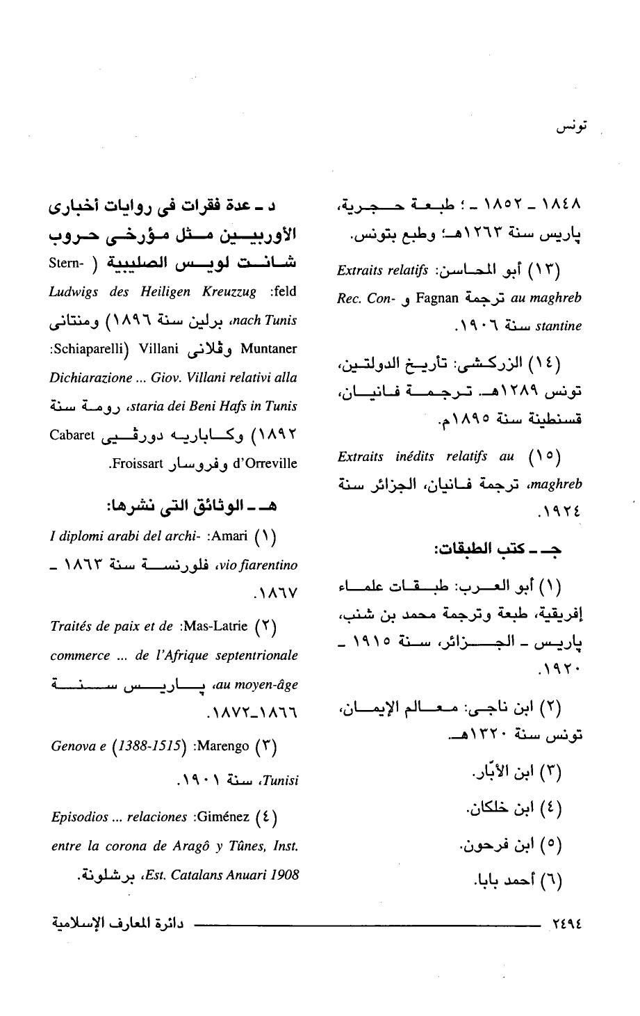 د- عدة فقرات في روايات أخبارى الأوربيين مثل مؤرخى حروب شانت لويس الصليبية (- Stern LudwiRs des HeiliRen Kreuzzug: feld , nach Tunis برلين سنة 1896) ومنتانى Muntaner وفلانى Schiaparelli) Villani: Dichiarazione ... Giov. Villani relativi alla staria dei Beni Hafs in Tunis، رومة سنة 1892) وكاباريه دورفيى Cabaret a d'Orreville وفروسار. Froissart