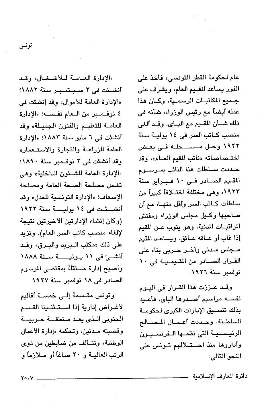 "الإدارة العامة للأشغال" وقد. أنشئت في 3 سبتمبر سنة 1882؛ "الإدارة العامة للأموال" وقد إنشئت في 4 نوفمبر من العام نفسه؛ "الإدارة العامة للتعليم والفنون الجميلة" وقد أنشئت في 6 مايو سنة 1883؛ "الإدارة العامة للزراعة والتجارة والاستعمار" وقد أنشئت في 3 نوفمبر سنة 1890؛ "الإدارة العامة للشئون الداخلية" وهي تشمل مصلحة الصحة العامة ومصلحة الإسعاف؛ "الإدارة التونسية للعدل" وقد أنشئت في 14 يولية سنة 1922 (وكان إنشاء الإدارتين الأخيرتين نتيجة لإلغاء منصب كاتب السر العام). ونزيد على ذلك "مكتب البريد والبرق" وقد أنشئ في 11 يونية سنة 1888 وأصبح إدارة مستقلة بمقتضى المرسوم الصادر في 18 نوفمبر سنة 1927 وتونس مقسمة إلى خمسة أقاليم لأغراض إدارية إذا استثنينا القسم الجنوبي الذي يعد منطقة حربية وقصبته مدنين، وتحكمه "إدارة الأعمال الوطنية" وتتألف من ضابطين من ذوي الرتب العالية و 20 صاغًا أو ملازمًا و