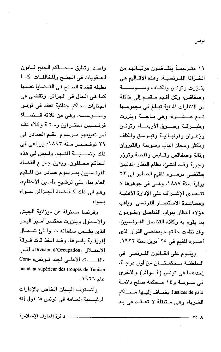 11 مترجمًا يتقاضون مرتباتهم من الخزانة الفرنسية. وهذه الأقاليم هي بنزرت وتونس والكاف وسوسة وصفاقس، وكل أقليم مقسم إلى طائفة من النظارات المدنية تبلغ في مجموعها تسع عشرة، وهي باجة وبنزرت وطبرقة وسوق الأربعاء وتونس وزغوان وقرنبالية وتبرسق والكاف ومكثر ومجاز الباب وسوسة والقيروان وتالة وصفاقس وقابس وقفصة وتوزر وجربة وقد أنشئ. نظام النظار المدنيين بمقتضى مرسوم المقيم الصادر في 22 يولية سنة 1887. وهي في جوهرها لا تتعدى الإشراف على الإدارة الأهلية ومساعدة الاستعمار الفرنسى. ويلقب هؤلاء النظار بنواب القناصل ويقومون بما يقوم به وكلاء القناصل الفرنسيين. وقد نظمت حالتهم بمقتضى القرار الذي أصدره المقيم في 25 أبريل سنة 1922.