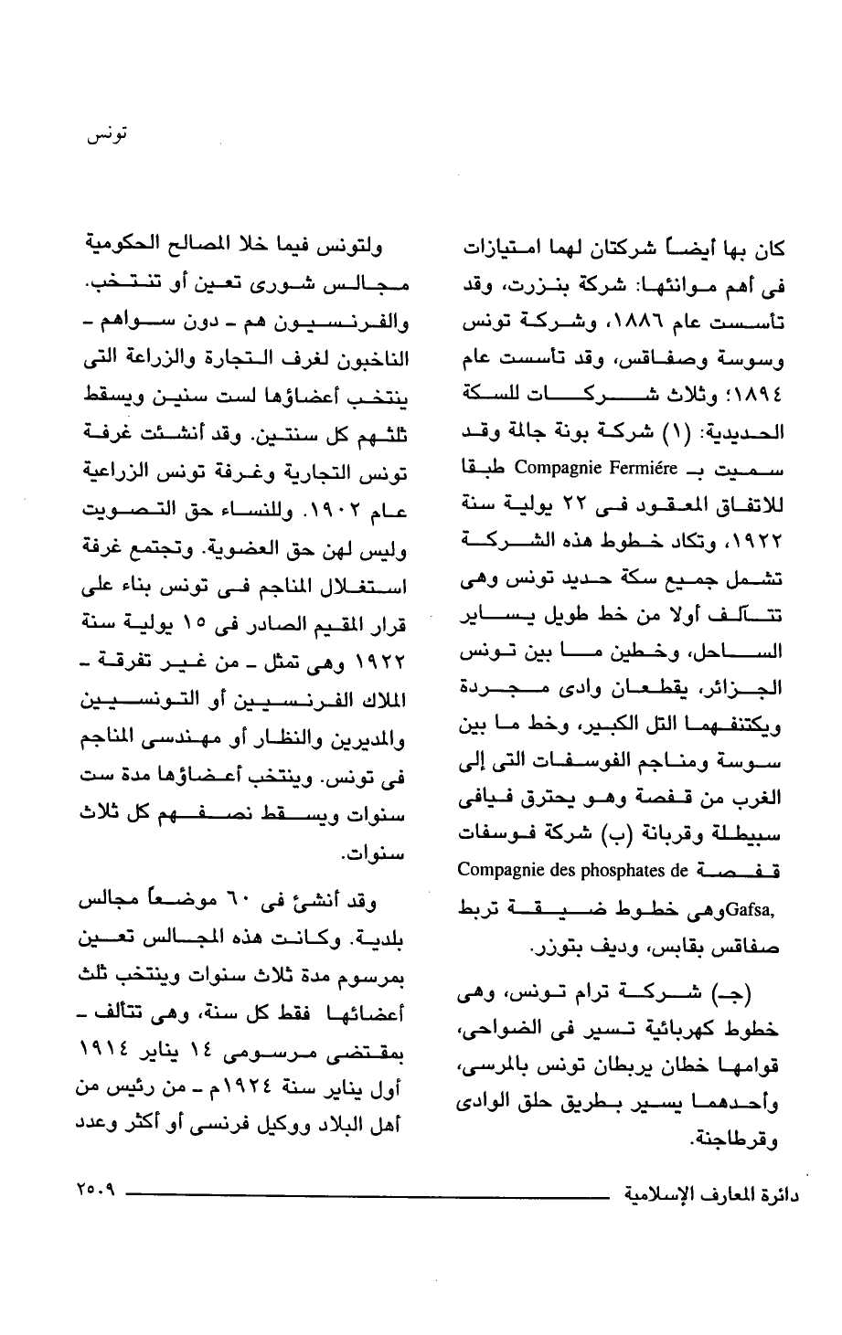 كان بها أيضًا شركتان لهما امتيازات في أهم موانئها: شركة بنزرت، وقد تأسست عام 1886, وشركة تونس وسوسة وصفاقس، وقد تأسست عام 1894؛ وثلاث شركات للسكة الحديدية: (1) شركة بونة جالمة وقد سميت بـ Compagnie Fermiere طبقا للاتفاق المعقود في 22 يولية سنة 1922، وتكاد خطوط هذه الشركة تشمل جميع سكة حديد تونس وهي تتآلف أولًا من خط طويل يساير الساحل، وخطين ما بين تونس الجزائر، يقطعان وادي مجردة ويكتنفهما التل الكبير، وخط ما بين سوسة ومناجم الفوسفات التي إلى الغرب من قفصة وهو يحترق فيافى سبيطلة وقربانة (ب) شركة فوسفات قفصة Compagnie des phosphates de , Gafsa وهي خطوط ضيقة تربط صفاقس بقابس، وديف بتوزر.