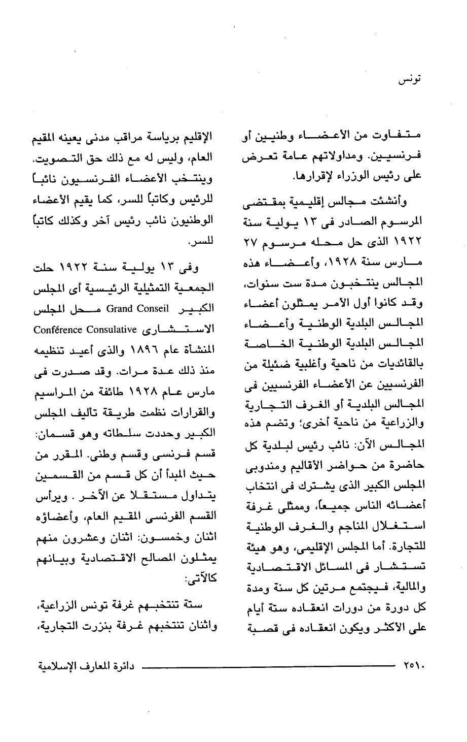 وأنشئت مجالس إقليمية بمقتضى المرسوم الصادر في 13 يولية سنة 1922 الذي حل محله مرسوم 27 مارس سنة 1928, وأعضاء هذه المجالس ينتخبون مدة ست سنوات، وقد كانوا أول الأمر يمثلون أعضاء المجالس البلدية الوطنية وأعضاء المجالس البلدية الوطنية الخاصة بالقائديات من ناحية وأغلبية ضئيلة من الفرنسيين عن الأعضاء الفرنسيين في المجالس البلدية أو الغرف التجارية والزراعية من ناحية أخرى؛ وتضم هذه المجالس الآن: نائب رئيس لبلدية كل حاضرة من حواضر الأقاليم ومندوبى المجلس الكبير الذي يشترك في انتخاب أعضائه الناس جميعًا، وممثلى غرفة استغلال المناجم والغرف الوطنية للتجارة. أما المجلس الإقليمى، وهو هيئة تستشار في المسائل الاقتصادية والمالية، فيجتمع مرتين كل سنة ومدة كل دورة من دورات انعقاده ستة أيام على الأكثر ويكون انعقاده في قصبة الإقليم برياسة مراقب مدنى يعينه المقيم العام، وليس له مع ذلك حق التصويت. وينتخب الأعضاء الفرنسيون نائبًا للرئيس وكاتبًا للسر، كما يقيم الأعضاء الوطنيون نائب رئيس آخر وكذلك كاتبًا للسر.
