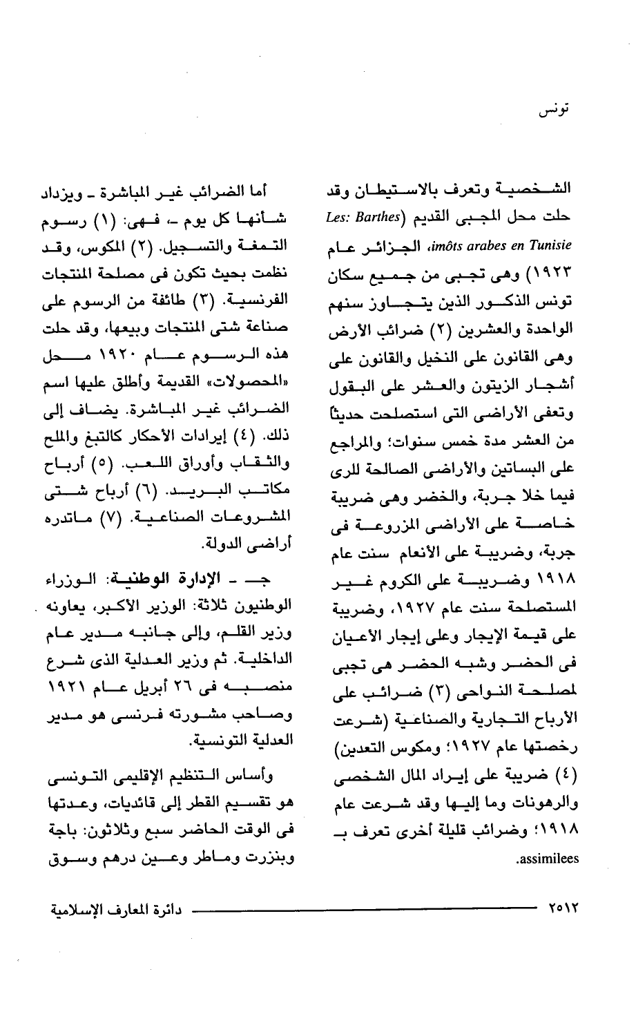 الشخصية وتعرف بالاستيطان وقد حلت محل المجبى القديم (la-c: Barthes Tunisie imots arabes en، الجزائر عام 1923) هي تجبى من جميع سكان تونس الذكور الذين يتجاوز سنهم الواحدة والعشرين (2) ضرائب الأرض وهي القانون على النخيل والقانون على أشجار الزيتون والعشر على البقول وتعفى الأراضي التي استصلحت حديثًا من العشر مدة خمس سنوات؛ والمراجع على البساتين والأراضى الصالحة للرى فيما خلا جربة، والخضر وهي ضريبة خاصة على الأراضي المزروعة في جربة، وضريبة على الأنعام سنت عام 1918 وضريبة على الكروم غير المستصلحة سنت عام 1927, وضريبة على قيمة الإيجار وعلى إيجار الأعيان في الحضر وشبه الحضر هي تجبى لمصلحة النواحى (3) ضرائب على الأرباح التجارية والصناعية (شرعت رخصتها عام 1927؛ ومكوس التعدين) (4) ضريبة على إيراد المال الشخصى والرهونات وما إليها وقد شرعت عام 1918؛ وضرائب قليلة أخرى تعرف بـ assimilees .