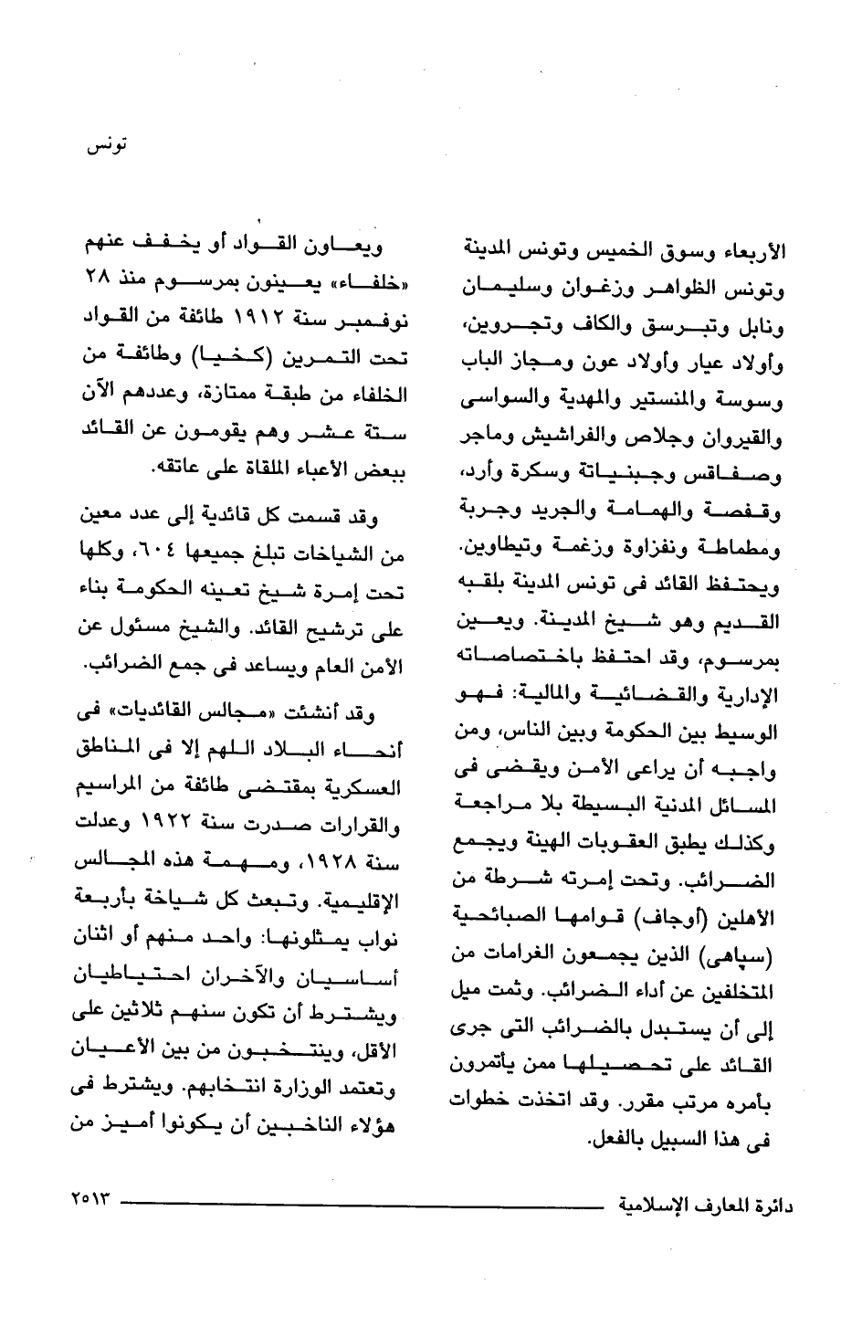 الأربعاء وسوق الخميس وتونس المدينة وتونس الظواهر وزغوان وسليمان ونابل وتبرسق والكاف وتجروين، واولاد عيار وأولاد عون ومجاز الباب وسوسة والمنستير والمهدية والسواسى والقيروان وجلاص والفراشيش وماجر وصفاقس وجبنياتة وسكرة وأرد، وقفصة والهمامة والجريد وجربة ومطماطة ونفزاوة وزغمة وتيطاوين. ويحتفظ القائد في تونس المدينة بلقبه القديم وهو شيخ المدينة. ويعين بمرسوم، وقد احتفظ باختصاصاته الإدارية والقضائية والمالية: فهو الوسيط بين الحكومة وبين الناس، ومن واجبه لم ن يراعى الأمن ويقضى في المسائل المدنية البسيطة بلا مراجعة وكذلك يطبق العقوبات الهينة ويجمع الضرائب. وتحت إمرته شرطة من الأهلين (أوجاف) قوامها الصبائحية (سباهى) الذين يجمعون الغرامات من المتخلفين عن أداء الضرائب. وثمت ميل إلى أن يستبدل بالضرائب التي جرى القائد على تحصيلها ممن يأتمرون بأمره مرتب مقرر. وقد اتخذت خطوات في هذا السبيل بالفعل.