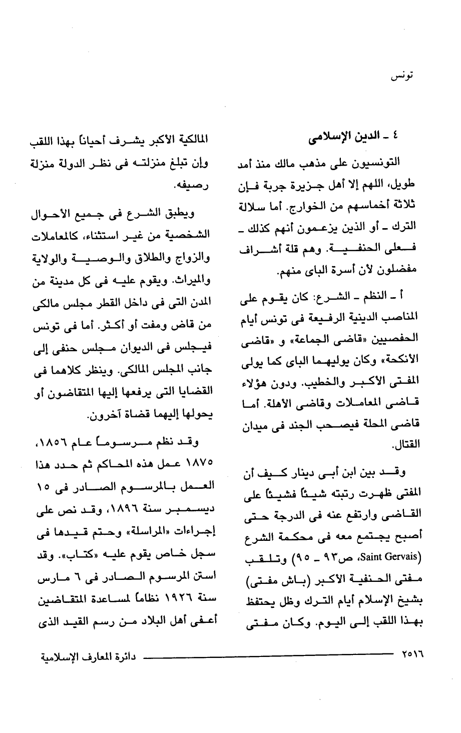 التونسيون على مذهب مالك منذ أمد طويل، اللهم إلَّا أهل جزيرة جربة فإن ثلاثة أخماسهم من الخوارج. أما سلالة الترك -أو الذين يزعمون أنهم كذلك - فعلى الحنفية. وهم قلة أشراف مفضلون لأن أسرة الباى منهم.