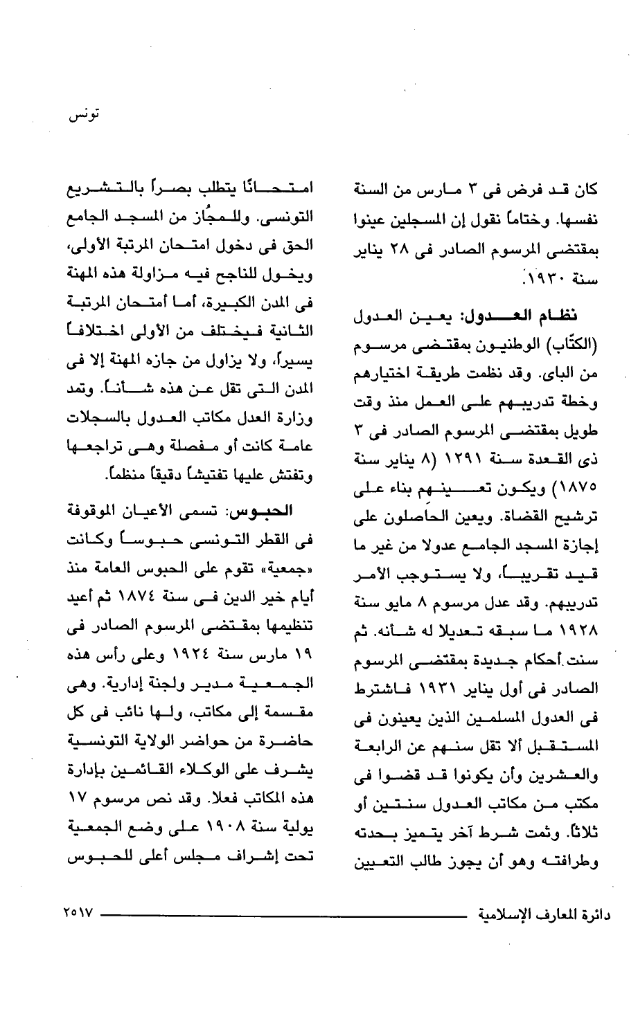 نظام العدول: يعين العدول (الكتّاب) الوطنيون بمقتضى مرسوم من الباى. وقد نظمت طريقة اختيارهم وخطة تدريبهم على العمل منذ وقت طويل بمقتضى المرسوم الصادر في 3 ذي القعدة سنة 1291 (8 يناير سنة 1875) ويكون تعينهِم بناء على ترشيح القضاة. ويعين الحاصلون على إجازة المسجد الجامع عدولا من غير ما قيد تقريبًا، ولا يستوجب الأمر تدريبهم. وقد عدل مرسوم 8 مايو سنة 1928 ما سبقه تعديلا له شأنه. ثم سنت أحكام جديدة بمقتضى المرسوم الصادر في أول يناير 1931 فاشترط في العدول المسلمين الذين يعينون في المستقبل ألا تقل سنهم عن الرابعة والعشرين وأن يكونوا قد قضوا في مكتب من مكاتب العدول سنتين أو ثلاثًا. وثمت شرط آخر يتميز بحدته وطرافته وهو أن يجوز طالب التعيين امتحانًا يتطلب بصرًا بالتشريع التونسى. وللمجاز من المسجد الجامع الحق في دخول امتحان المرتبة الأولى، ويخول للناجح فيه مزاولة هذه المهنة في المدن الكبيرة، أما أمتحان المرتبة الثانية فيختلف من الأولى اختلافًا يسيرًا، ولا يزاول من جازه المهنة إلَّا في المدن التي تقل عن هذه شأنًا. وتمد وزارة العدل مكاتب العدول بالسجلات عامة كانت أو مفصلة وهي تراجعها وتفتش عليها تفتيشًا دقيقًا منظمًا.