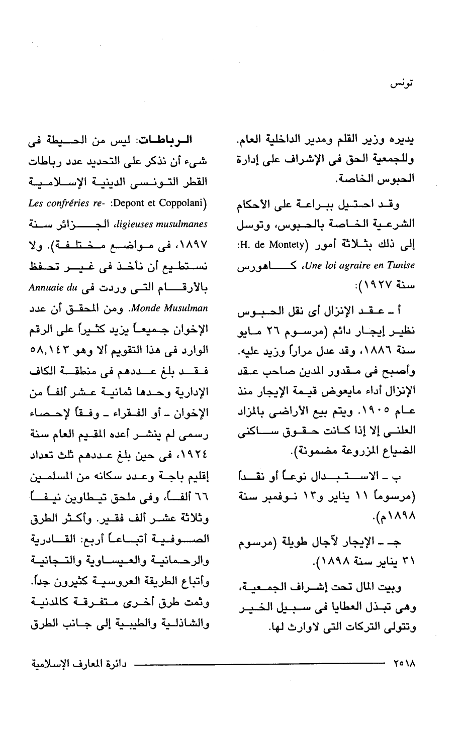 الرباطات: ليس من الحيطة في شيء أن نذكر على التحديد عدد رباطات القطر التونسى الدينية الإسلامية (Les confreries re-: Depont et Coppolani , ligieuses musulmanes الجزائر سنة 1897, في مواضع مختلفة). ولا نستطيع أن نأخذ في غير تحفظ بالأرقام التي وردت في Annuaia du Monde Musulman . ومن المحقق أن عدد الإخوان جميعًا يزيد كثيرًا على الرقم الوارد في هذا التقويم ألا وهو 58, 143 فقد بلغ عددهم في منطقة الكاف الإدارية وحدها ثمانية عشر ألفًا من الإخوان -أو الفقراء - وفقا لإحصاء رسمى لم ينشر أعده المقيم العام سنة 1924, في حين بلغ عددهم ثلث تعداد إقليم باجة وعدد سكانه من المسلمين 61 ألفًا، وفي ملحق تيطاوين نيفًا وثلاثة عشر ألف فقير. وأكثر الطرق الصوفية أتباعًا أربع: القادرية والرحمانية والعيساوية والتجانية وأتباع الطريقة العروسية كثيرون جدًّا. وثمت طرق أخرى متفرقة كالمدنية والشاذلية والطيبية إلى جانب الطرق