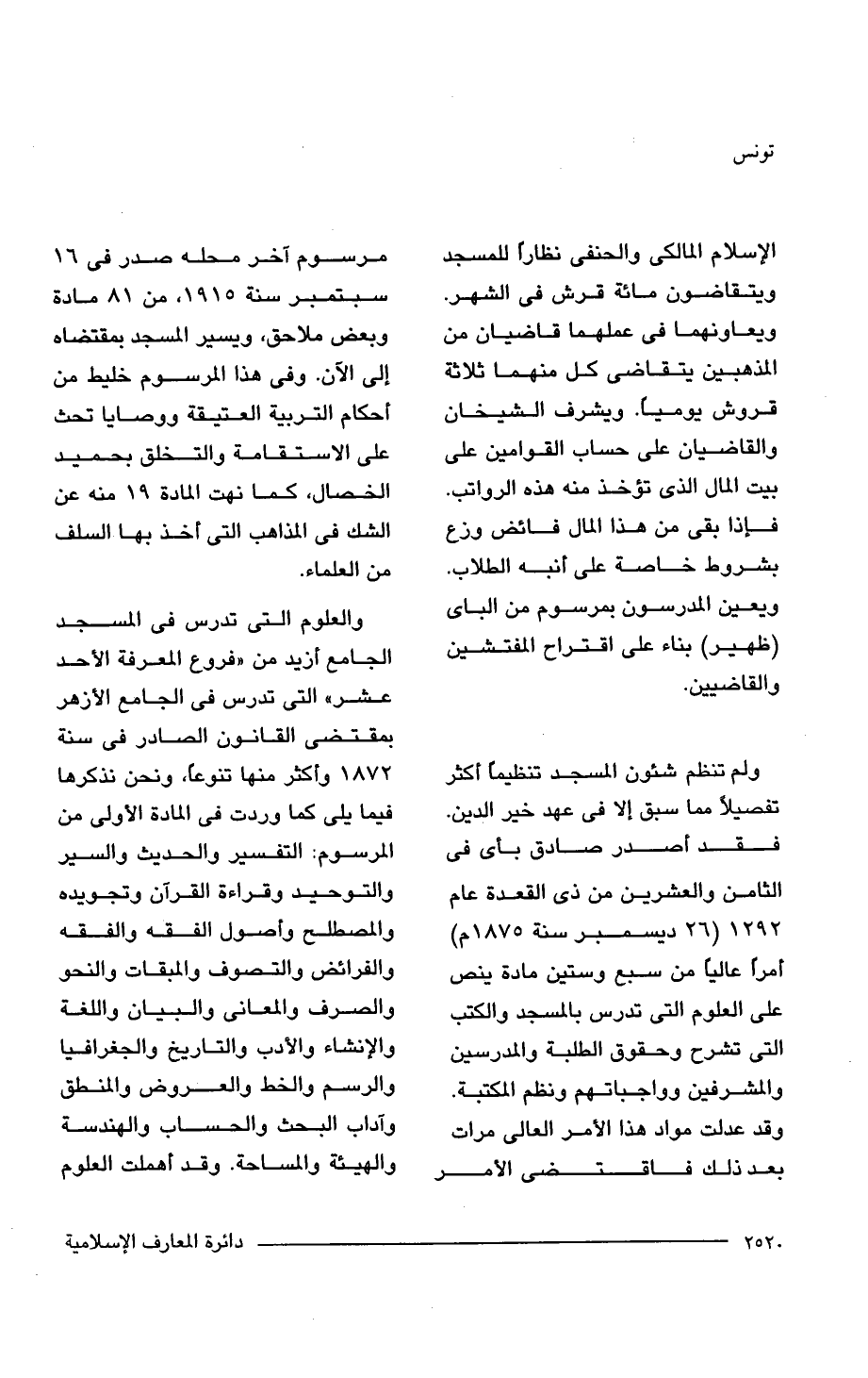 ولم تنظم شئون المسجد تنظيمًا أكثر تفصيلًا مما سبق إلَّا في عهد خير الدين. فقد أصدر صادق بأى في الثامن والعشرين من ذي القعدة عام 1292 (26 ديسمبر سنة 1845 م) أمرًا عاليًا من سبع وستين مادة ينص على العلوم التي تدرس بالمسجد والكتب التي تشرح وحقوق الطلبة والمدرسين والمشرفين وواجباتهم ونظم المكتبة. وقد عدلت مواد هذا الأمر العالى مرات بعد ذلك فاقتضى الأمر مرسوم آخر محله صدر في 16 سبتمبر سنة 1915. من 81 مادة وبعض ملاحق، ويسير المسجد بمقتضاه إلى الآن. وفي هذا المرسوم خليط من أحكام التربية العتيقة ووصايا تحث على الاستقامة والتخلق بحميد الخصال، كما نهت المادة 19 منه عن الشك في المذاهب التي أخذ بها السلف من العلماء.