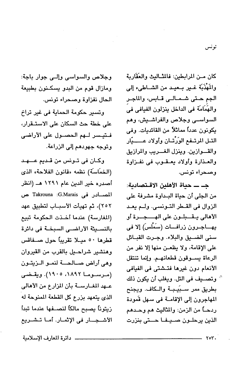 جـ- حياة الأهلين الاقتصادية: من الجلى أن حياة البداوة مشرفة على الزوال في القطر التونسى. ولم يعد الأهالى يقبلون على الهجرة أو يهاجرون زرافات (سَمْلسَ) إلَّا في سنى الضيق والبلاء. وجرت القبائل على الإقامة، ولا يظعن منها إلَّا نفر من الرعاة يسوقون قطعانهم. وإنما تنتقل الأنعام دون غيرها فتشتى في الفيافى وتصيف في التل. ويغلب أن يكون ذلك بطريق ممر سبَيبة والكاف. ويجنح المهاجرون إلى الإقامة في سهل قَمودة ردحًا من الزمن: والمثاليث هم وحدهم الذين يرحلون صيفا حتى بنزرت وجلاص والسواسى دمالى جوار باجة: وما زال قوم من البدو يسكنون بطبيعة الحال نفزاوة وصحراء تونس.