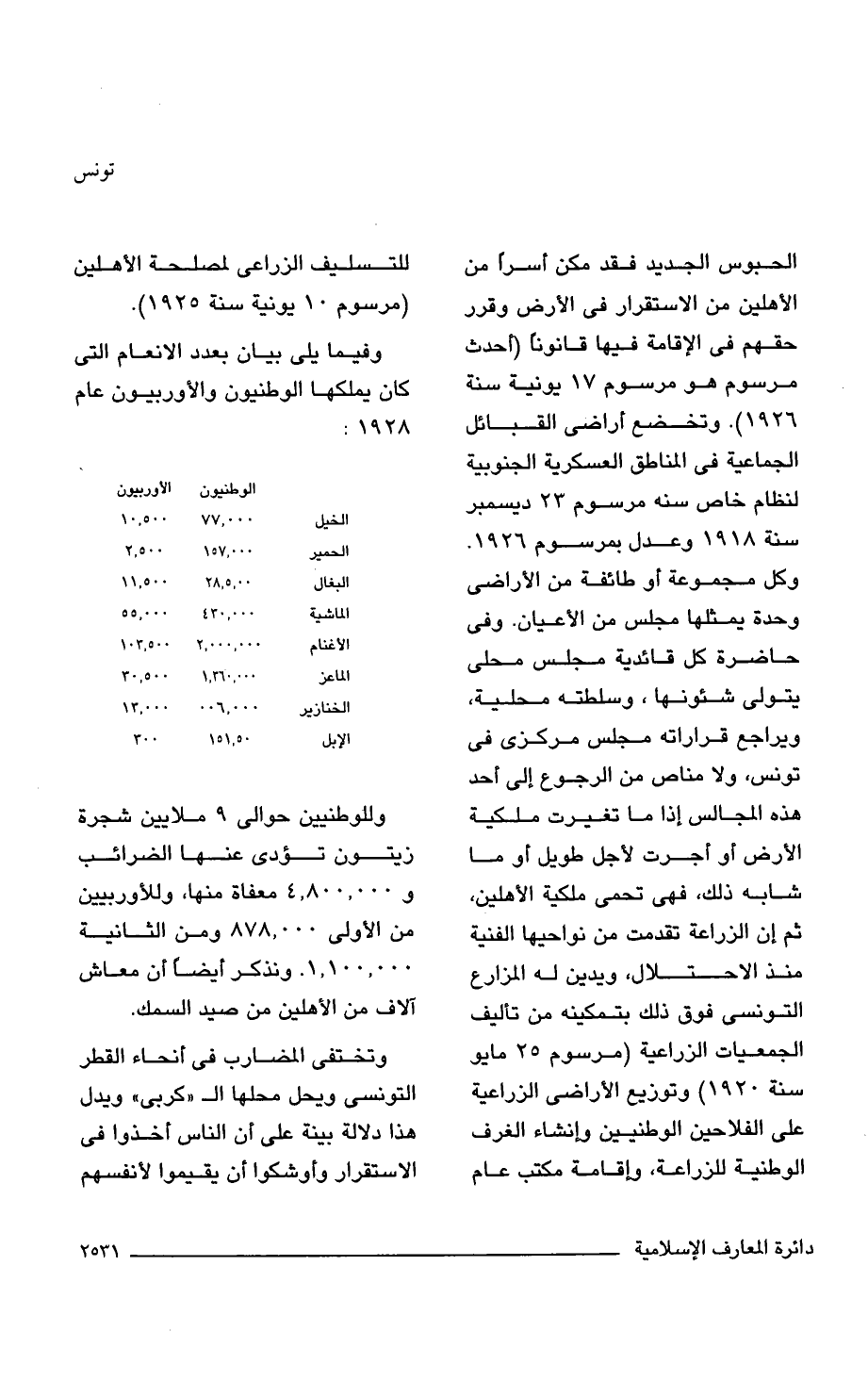 الحبوس الجديد فقد مكن أسرًا من الأهلين من الاستقرار في الأرض وقرر حقهم في الإقامة فيها قانونًا (أحدث مرسوم هو مرسوم 17 يونية سنة 1926). وتخضع أراضى القبائل الجماعية في المناطق العسكرية الجنوبية لنظام خاص سنه مرسوم 23 ديسمبر سنة 1918 وعدل بمرسوم 1926. وكل مجموعة أو طائفة من الأراضي وحدة يمثلها مجلس من الأعيان. وفي حاضرة كل قائدية مجلس على يتولى شئونها، وسلطته محلية، ويراجع قراراته مجلس مركزى في تونس، ولا مناص من الرجوع إلى أحد هذه المجالس إذا ما تغيرت ملكية الأرض) وأجرت لأجل طويل أو ما شابه ذلك، فهي تحمى ملكية الأهلين، ثم إن الزراعة تقدمت من نواحيها الفنية منذ الاحتلال، ويدين له المزارع التونسى فوق ذلك بتمكينه من تأليف الجمعيات الزراعية (مرسوم 25 مايو سنة 1920) وتوزيع الأراضي الزراعية على الفلاحين الوطنيين وإنشاء الغرف الوطنية للزراعة، وإقامة مكتب عام للتسليف الزراعى لمصلحة الأهلين (مرسوم 10 يونية سنة 1925).