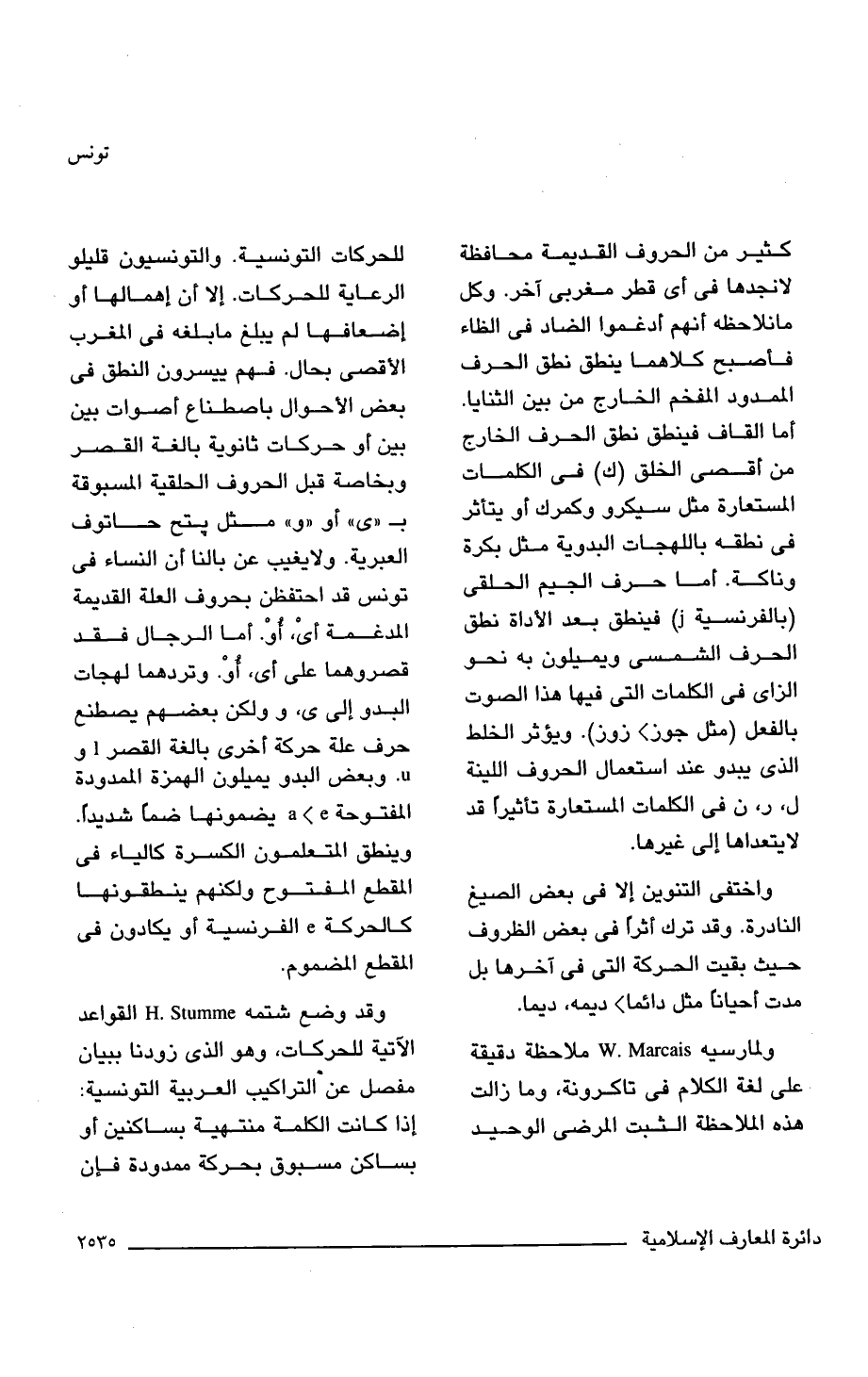 ولمارسيه W. Marcais ملاحظة دقيقة على لغة الكلام في تاكرونة، وما زالت هذه الملاحظة الثبت المرضى الوحيد للحركات التونسية. والتونسيون قليلو الرعاية للحركات. إلَّا أن إهمالها أو إضعافها لم يبلغ ما بلغه في المغرب الأقصى بحال. فهم ييسرون النطق في بعض الأحوال باصطناع أصوات بين بين أو حركات ثانوية بالغة القصر وبخاصة قبل الحروف الحلقية المسبوقة بـ "ى" أو "و" مثل بتح حاتوف العبرية. ولا يغيب عن بالنا أن النساء في تونس قد احتفظن بحروف العلة القديمة المدغمة أي، أوْ. أما الرجال فقد قصروهما على أي، أوْ. وتردهما لهجات البدو إلى ى, وولكن بعضهم يصطنع حرف علة حركة أخرى بالغة القصر i و u. وبعض البدو يميلون الهمزة الممدودة المفتوحة e > a يضمونها ضمًا شديدًا. وينطق المتعلمون الكسرة كالياء في المقطع المفتوح ولكنهم ينطقونها كالحركة e الفرنسية أو يكادون في المقطع المضموم.