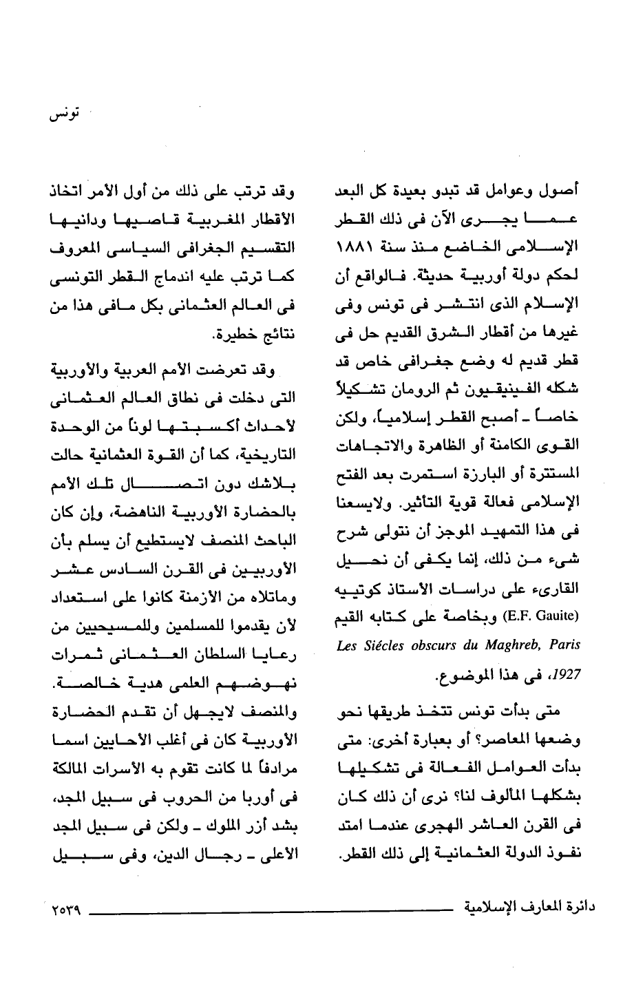 أصول وعوامل قد تبدو بعيدة كل البعد عما يجرى الآن في ذلك القطر الإسلامي الخاضع منذ سنة 1881 لحكم دولة أوربية حديثة. فالواقع أن الإسلام الذي انتشر في تونس وفي غيرها من أقطار الشرق القديم حل في قطر قديم له وضع جغرافي خاص قد شكله الفينيقيون ثم الرومان تشكيلًا خاصًّا- أصبح القطر إسلاميًا، ولكن القوى الكامنة أو الظاهرة والاتجاهات المستترة أو البارزة استمرت بعد الفتح الإسلامي فعالة قوية التأير. ولا يسعنا في هذا التمهيد الموجز أن نتولى شرح شيء من ذلك، إنما يكفى أن نحيل القارئ على دراسات الأستاذ كوتييه (E.F. Gauite) وبخاصة على كتابه القيم Les Siecles obscurs du Maghreb, Paris 1927. في هذا الموضوع.