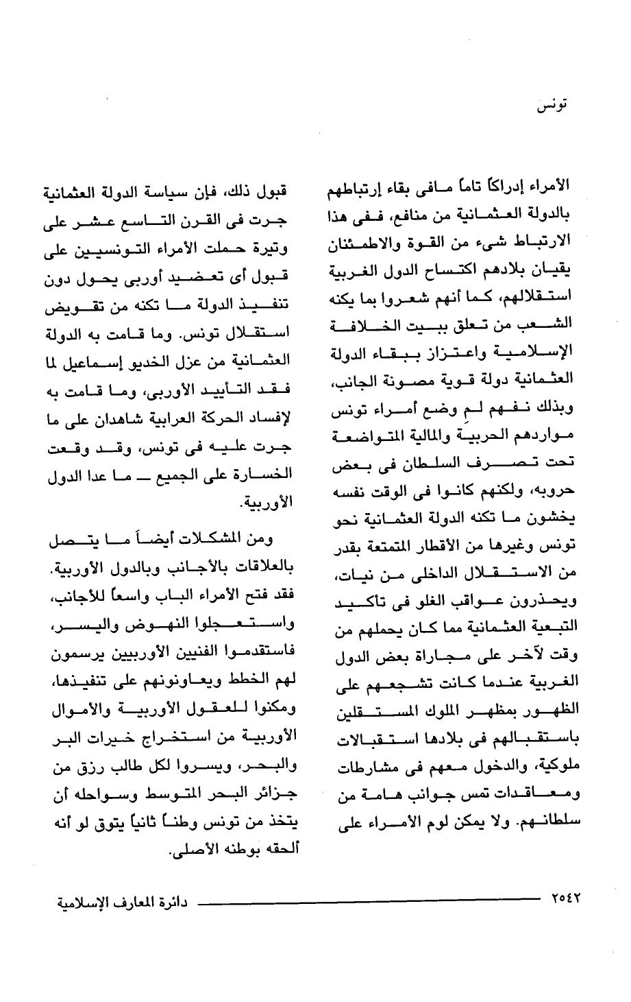 الأمراء إدراكًا تامًّا ما في بقاء إرتباطهم بالدولة العثمانية من منافع، ففي هذا الارتباط شيء من القوة والاطمئنان يقيان بلادهم اكتساح الدول الغربية استقلالهم، كما أنهم شعروا بما يكنه الشعب من تعلق ببيت الخلافة الإسلامية واعتزاز ببقاء الدولة العثمانية دولة قوية مصونة الجانب، وبذلك نفهم لم وضع أمراء تونس مواردهم الحربية والمالية المتواضعة تحت تصرف السلطان في بعض حروبه، ولكنهم كانوا في الوقت نفسه يخشون ما تكنه الدولة العثمانية نحو تونس وغيرها من الأقطار المتمتعة بقدر من الاستقلال الداخلى من نيات، ويحذرون عواقب الغلو في تأكيد التبعية العثمانية مما كان يحملهم من وقت لآخر على مجاراة بعض الدول الغربية عندما كانت تشجعهم على الظهور بمظهر الملوك الهستقلين باستقبالهم في بلادها استقبالات ملوكية، والدخول معهم في مشارطات ومعاقدات تمس جوانب هامة من سلطانهم. ولا يمكن لوم الأمراء على قبول ذلك، فإن سياسة الدولة العثمانية جرت في القرن التاسع عشر على وتيرة حملت الأمراء التونسيين على قبول أي تعضيد أوربى يحول دون تنفيذ الدولة ما تكنه من تقويض استقلال تونس. وما قامت به الدولة العثمانية من عزل الخديو إسماعيل لما فقد التأييد الأوربى، وما قامت به لإفساد الحركة العرابية شاهدان على ما جرت عليه في تونس، وقد وقعت الخسارة على الجميع - ما عدا الدول الأوربية.