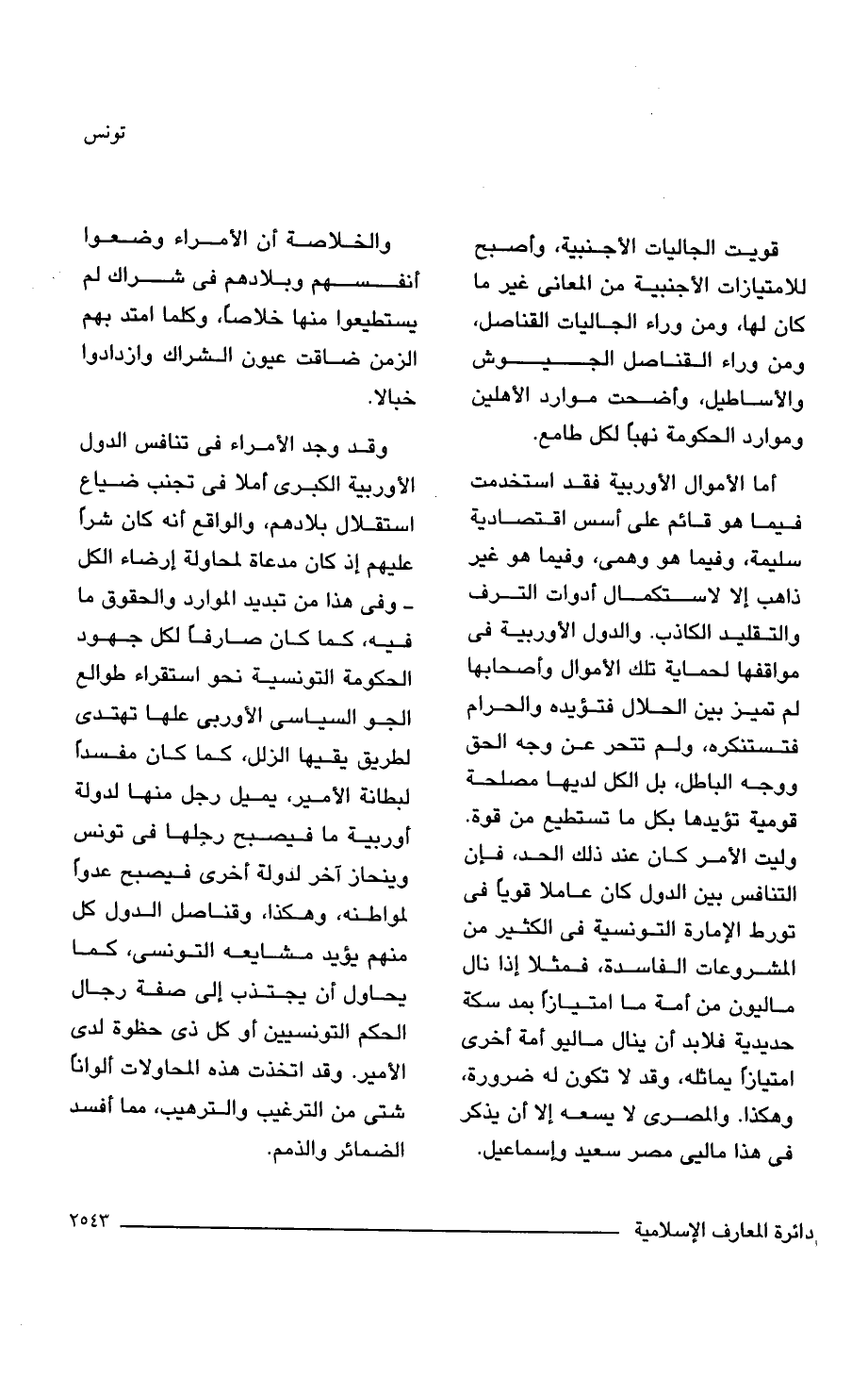 أما الأموال الأوربية فقد استخدمت فيما هو قائم على أسس اقتصادية سليمة، وفيما هو وهص، وفيما هو غير ذاهب إلَّا لاستكمال أدوات الترف والتقليد الكاذب. والدول الأوربية في مواقفها لحماية تلك الأموال وأصحابها لم تميز بين الحلال فتؤيده والحرام فتستنكره، ولم تتحر عن وجه الحق ووجه الباطل، بل الكل لديها مصلحة قومية تؤيدها بكل ما تستطيع من قوة. وليت الأمر كان عند ذلك الحد، فإن التنافس بين الدول كان عاملا قويًّا في تورط الإمارة التونسية في الكثير من المشروعات الفاسدة، فمثلا إذا نال ماليون من أمة ما امتيازًا بمد سكة حديدية فلا بد أن ينال ماليو أمة أخرى امتيازًا يماثله، وقد لا تكون له ضرورة، وهكذا. والمصرى لا يسعه إلَّا أن يذكر في هذا ماليى مصر سعيد وإسماعيل.