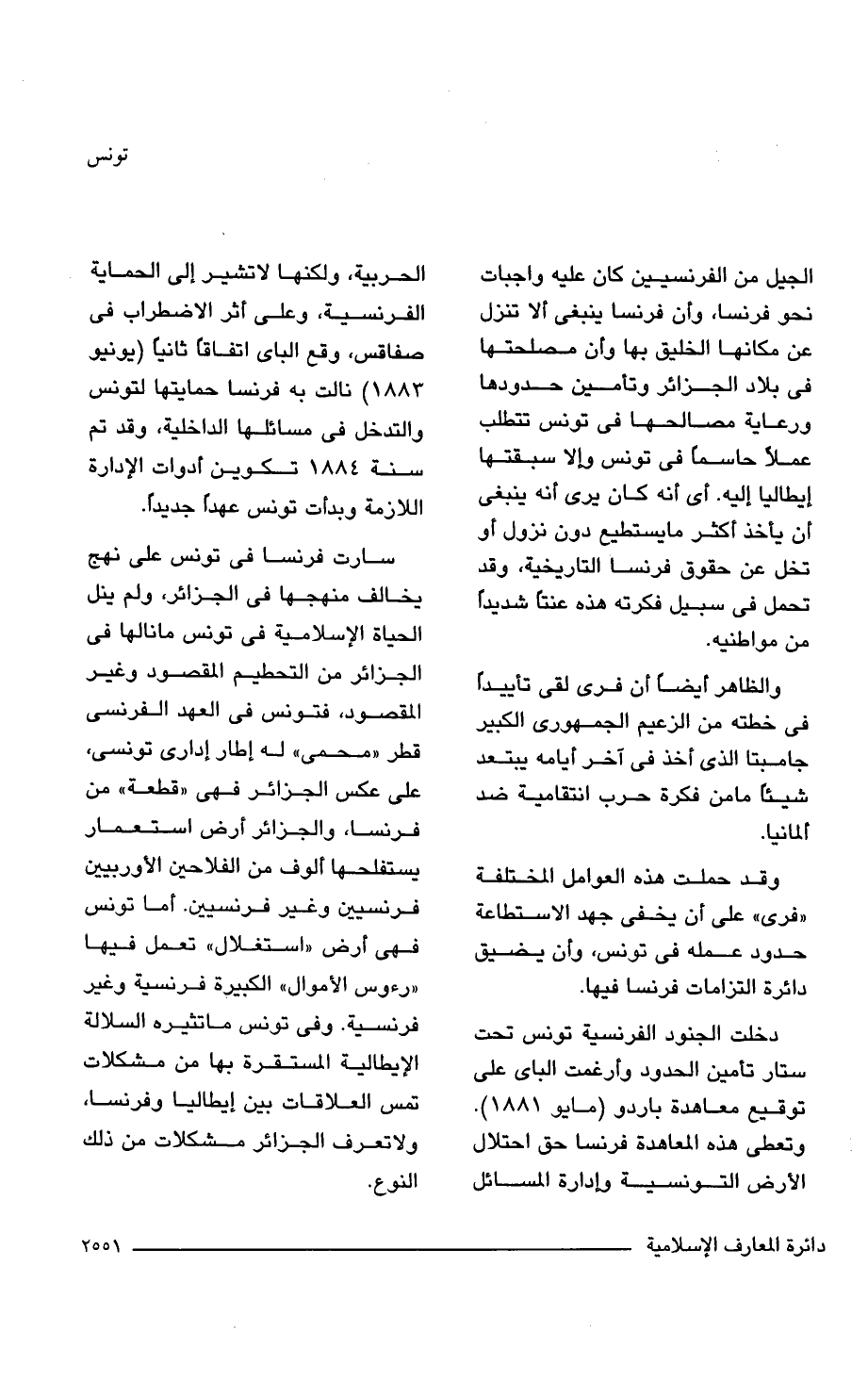 سارت فرنسا في تونس على نهج يخالف منهجها في الجزائر، ولم ينل الحياة الإسلامية في تونس ما نالها في الجزائر من التحطيم المقصود وغير المقصود، فتونس في العهد الفرنسى قطر "محمى" له إطار إدارى تونسى، على عكس الجزائر فهي "قطعة" من فرنسا، والجزائر أرض استعمار يستفلحها ألوف من الفلاحين الأوربيين فرنسيين وغير فرنسيين. أما تونس فهي أرض "استغلال" تعمل فيها "رءوس الأموال" الكبيرة فرنسية وغير فرنسية. وفي تونس ما تثيره السلالة الإيطالية المستقرة بها من مشكلات تمس العلاقات بين إيطاليا وفرنسا، ولا تعرف الجزائر مشكلات من ذلك النوع.