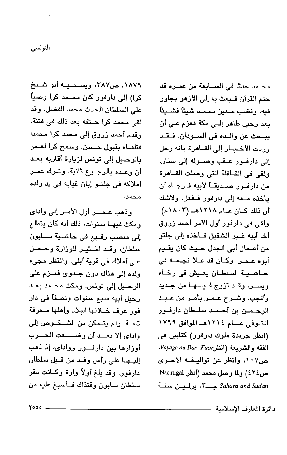 وذهب عمر أول الأمر إلى واداى ومكث فيها سنوات، ذلك أنه كان يتطلع إلى منصب رفيع في حاشية سابون سلطان، وقد اختير للوزارة وحصل على أملاك في قرية أبلى. وانتظر مجئ ولده إلى هناك دون جدوى فعزم على الرحيل إلى تونس. ومكث محمد بعد رحيل أبيه سبع سنوات ونصفًا في دار فور عرف خلالها البلاد وأهلها معرفة تامة. ولم يتمكن من الشخوص إلى واداى إلَّا بعد أن وضعت الحرب أوزارها بين دارفور وواداى، إذ ذهب إليها على رأس وفد من قبل سلطان دارفور. وقد بلغ أولًا وارة وكانت مقر سلطان سابون وقتذاك فأسبغ عليه من
