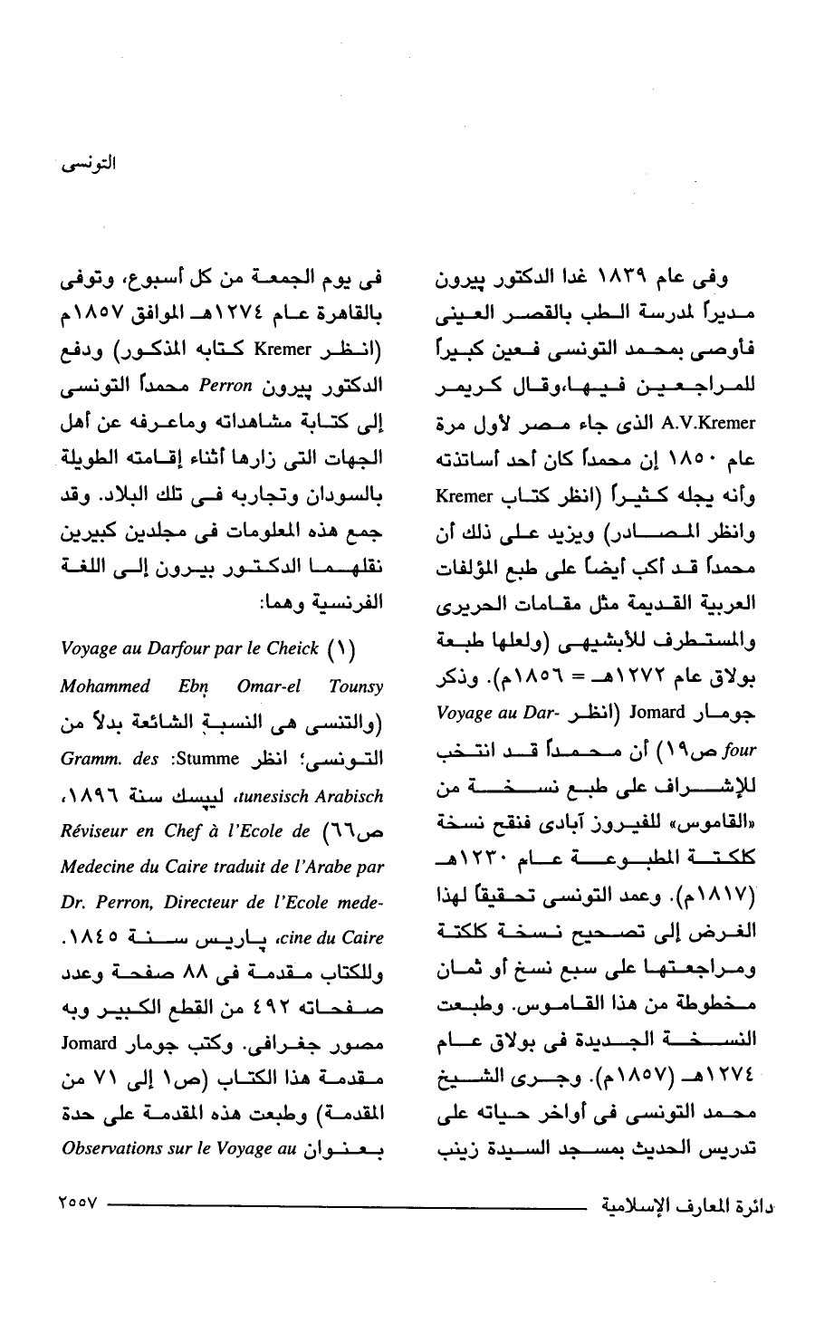 (1) Voyage au Darfour par le Cheick Omar-el Tounsy Mohammed Ebn (والتنسى هي النسبة الشائعة بدلًا من التونسى؛ انظر Gramm. des: Stumme tunesisch Arabisch، ليبسك سنة 1896, ص 66). Reviseur en Chef a l'Ecole de Medecine du Caire traduit de l'Arabe par -Dr. Perron. Directeur de l'Ecole mede cine du Caine، باريس سنة 1845. وللكتاب مقدمة في 88 صفحة وعدد صفحاته 492 من القطع الكبير وبه مصور جغرافي. وكتب جومار Jomard مقدمة هذا الكتاب (ص 1 إلى 71 من المقدمة) وطبعت هذه المقدمة على حدة بعنوان Observations sur le Voyage au
