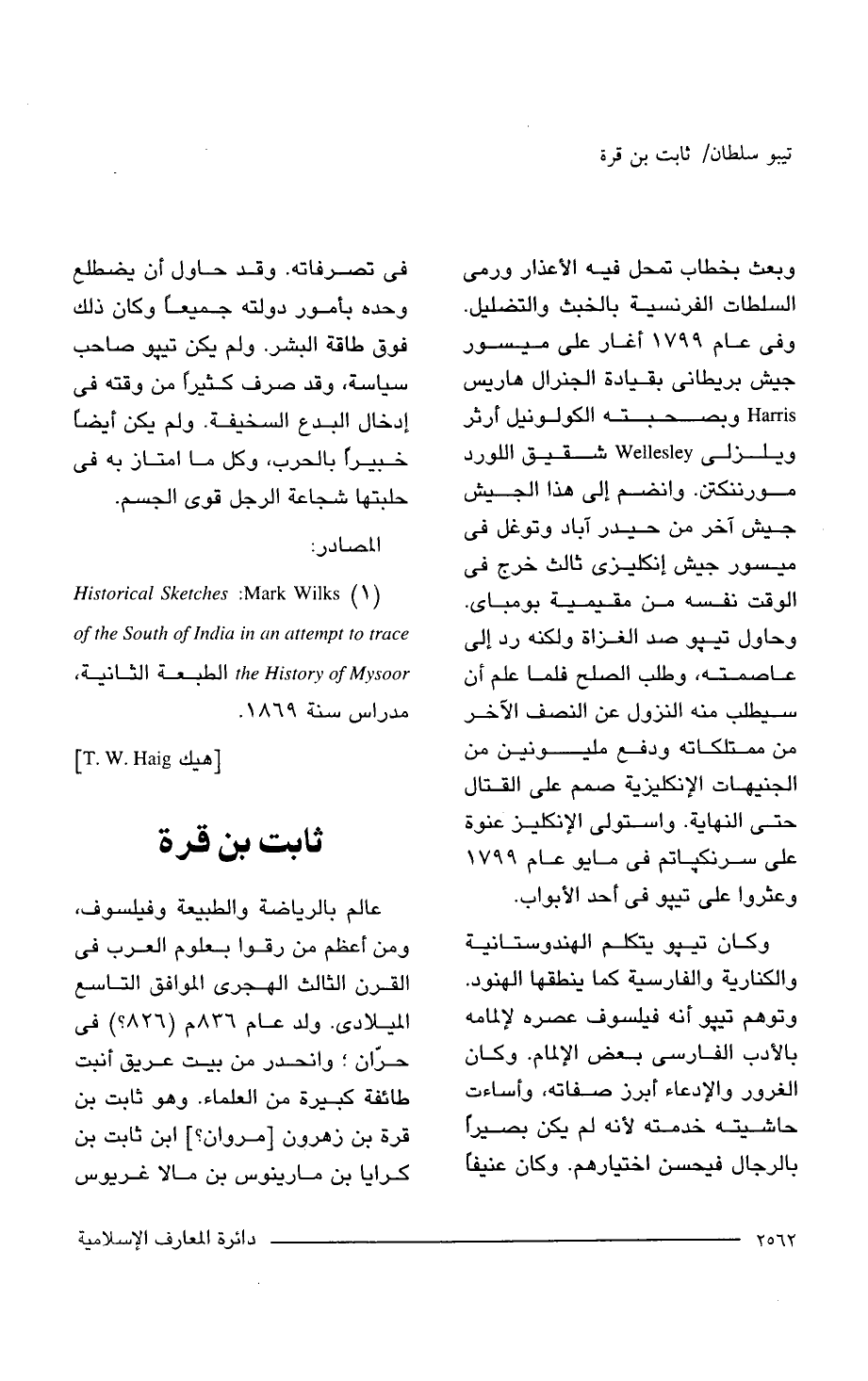 (1) Historical Sketches: Mark Wilks of the South of India in an attempt to trace the History of Mysoor الطبعة الثانية، مدراس سنة 1869.