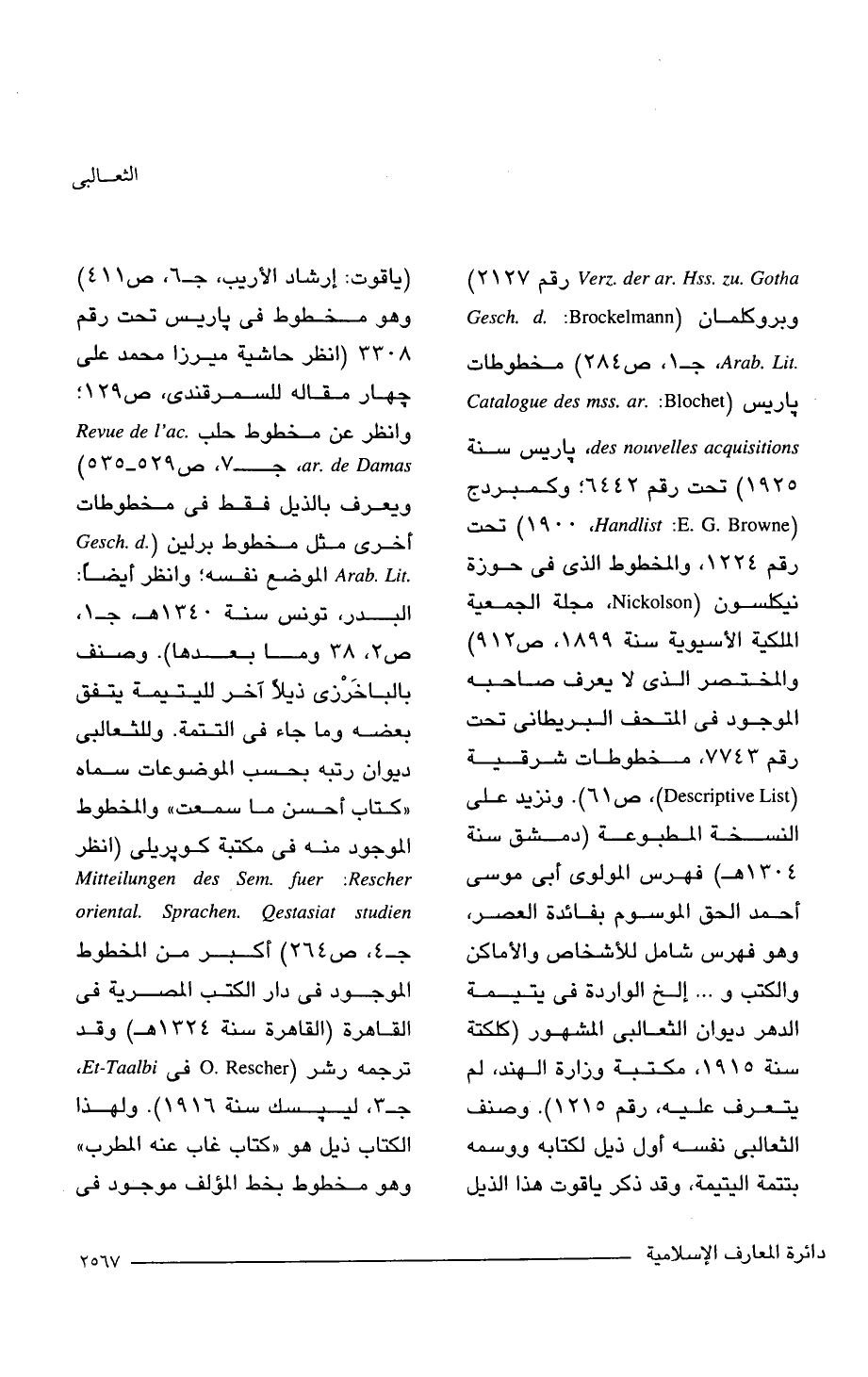 Verz. der ar. Hss. zu. Gotha رقم 2127) وبروكلمان (gesch. d. -Brockelmann .Arab. Lit، جـ 1، ص 284) مخطوطات باريس (Catalogue des mss. ar.: Blochet des nouvelles acquisitions, باريس سنة 1925) تحت رقم 6442؛ وكمبردج (Handlist: E. G. Browne , 1900) تحت رقم 1224. والمخطوط الذي في حوزة نيكلسون (Nickolson. مجلة الجمعية الملكية الأسيوية سنة 1899، ص 912) والمختصر الذي لا يعرف صاحبه الموجود في المتحف البريطانى تحت رقم 7743, مخطوطات شرقية (descriptive List)، ص 61). ونزيد على النسخة المطبوعة (دمشق سنة 1304 هـ) فهرس المولوى أبي موسى أحمد الحق الموسوم بفائدة العصر، وهو فهرس شامل للأشخاص والأماكن والكتب و ... إلخ الواردة في يتيمة الدهر ديوان الثعالبى المشهور (كلكتة سنة 1915، مكتبة وزارة الهند، لم يتعرف عليه، رقم 1215). وصنف الثعالبى نفسه أول ذيل لكتابه ووسمه بتتمة اليتيمة، وقد ذكر ياقوت هذا الذيل (ياقوت: إرشاد الأريب، جـ 6، ص 411) وهو مخطوط في باريس تحت رقم 3308 (انظر حاشية ميرزا محمد على جهار مقاله للسمرقندى، ص 129؛ وانظر عن مخطوط حلب. Revue de l'ac ar. de Damas, جـ 7، ص 529 - 535) ويعرف بالذيل فقط في مخطوطات أخرى مثل مخطوط برلين (. Gesrh . d Arah. Lit. الموضع نفسه؛ وانظر أيضًا: البدر، تونس سنة 1340 هـ, جـ 1، ص 2، 38 وما بعدها). وصنف بالباخَرْزى ذيلًا آخر لليتيمة يتفق بعضه وما جاء في التتمة. وللثعالبى ديوان رتبه بحسب الموضوعات سماه "كتاب أحسن ما سمعت" والمخطوط الموجود منه في مكتبة كوبريلى (انظر Mitteilungen des Son. fuer: Rescher oriental. Sprachen. Qestasiat studien جـ 4, ص 264) أكبر من المخطوط الموجود في دار الكتب المصرية في القاهرة (القاهرة سنة 1324 هـ) وقد ترجمه رشر (O. Rescher في Et-Taalbi, جـ 3، ليبسك سنة 1916). ولهذا الكتاب ذيل هو "كتاب غاب عنه المطرب" وهو مخطوط بخط المؤلف موجود في