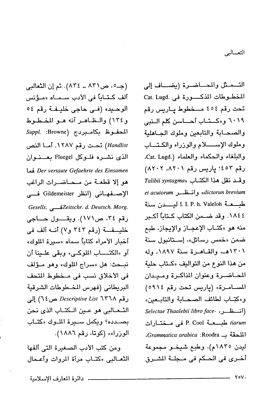 التمثل والمحاضرة (يضاف إلى المخطوطات المذكورة في , Cat. Lugd تحت رقم 454 مخطوط باريس رقم 6019 و"كتاب أحاسن كلم النبي والصحابة والتابعين وملوك الجاهلية وملوك الإسلام والوزراء والكتاب والبلغاء والحكماء والعلماء (. Cat. Lugd, رقم 453؛ باريس رقم 8201, 8202) وقد نقل هذا الكتاب " Talibii syntagma "dictorun brevium وانظر et acutorum طبعة l.l .P. h. Valeloh ليدن سنة 1844. وقد ضمن الكتاب كتابًا أكبر منه هو "كتاب الإعجاز والإيجاز، طبع ضمن "خمس رسائل"، إستانبول سنة 1301 هـ, والقاهرة سنة 1897، وله من هذا النوع من التواليف "كتاب حلية المحاضرة وعنوان المذاكرة وميدان المسامرة" (باريس تحت رقم 5914) و"كتاب لطائف الصحابة والتابعين" (انظر، - Selectae Thaalebii libro face tiarum طبعة P.Cool في مختارات الملحقة بـ Grammatica arabica: Roodra. ليدن 1835 م)، وطبع شيخو مجموعة أخرى في الحكم في مجلة المشرق (جـ 5, ص 831 - 834). ثم إن الثعالبى ألف كتابًا في الأدب سماه "مؤنس الوحيد" (في حاجى خليفة رقم 54 و 134) والظاهر أنه هو المخطوط المحفوظ بكامبردج) Suppl.: Browne Handlisi) تحت رقم 1287. أما النص الذي نشره فلوكل Fluegel بعنوان Der vertaute Gefaehrte des Einsamen فما هو إلَّا قطعة من محاضرات الراغب الإصفها في (انظر Gildemeister في. iZeitschr. d. Deutsch. Morg, في. Gesells رقم 34، ص 171). ويقول حاجى خليفة (رقم 343 و 7) أنه ألف في أخبار الأمراء كتابًا سماه "سيرة الملوك" أو "الكتاب الملوكى" وبقى علينا أن نبحث: هل "سراج الملوك" وهو مؤلف في الأخلاق نسب في مخطوط المتحف البريطانى (فهرس المخطوطات الشرقية رقم 6368 Descriptive List ص 64) إلى الثعالبى هو عين الكتاب الذي نحن بصدده؟ ويكمل سيرة الملوك "كتاب الوزراء" (كوتا، رقم 1886).
