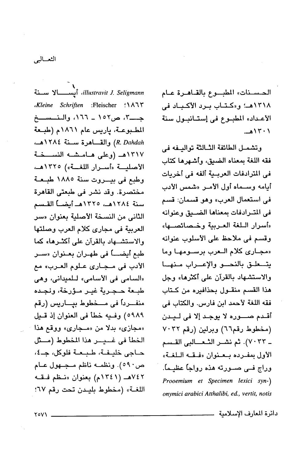وتشمل الطائفة الثالثة تواليفه في فقه اللغة بمعناه الضيق، وأشهرها كتاب في المترادفات العربية ألفه في أخريات أيامه وسماه أول الأمر "شمس الأدب في استعمال العرب" وهو قسمان: قسم في المترادفات بمعناها الضيق وعنوانه "أسرار اللغة العربية وخصائصها" وقسم في ملاحظ على الأسلوب عنوانه "مجارى كلام العرب برسومها وما يتعلق باهنحو والإعراب منها والاستشهاد بالقرآن على أكثرها" وجل هذا القسم منقول بحذافيره من كتاب فقه اللغة لأحمد ابن فارس. والكتاب في أقدم صوره لا يوجد إلَّا في ليدن (مخطوط رقم 66) وبرلين (رقم 7032 - 7033). ثم نشر الثعالبى القسم الأول بمفرد , بعنوان "فقه اللغة" وراج في صورته هذه رواجًا عظيمًا. (- Prooemium et Specimen lexici syn onymici arabici atthalibi, ed., vertit, notis , illustravit J. Seligmann أبسالا سنة 1863؛ schriften: Fleischer، Kleine. جـ 3، ص 152 - 166. والنسخ المطبوعة، باريس عام 1861 م (طبعة (R. Dahdah والقاهرة سنة 1284 هـ, 1317 هـ (وعلى هامشه النسخة الأصلية "أسرار اللغة") 1325 هـ, وطبع في بيروت سنة 1885 طبعة مختصرة. وقد نشر في طبعتى القاهرة سنة 1284 هـ, 1325 هـ أيضًا القسم الثاني من النسخة الأصلية بعنوان "سر العربية في مجارى كلام العرب وصلتها والاستشهاد بالقرآن على أكثرها" كما طبع أيضًا في طهران بعنوان "سر الأدب في مجارى علوم العرب" مع "السامى في الأسامى" للميدانى، وهي طبعة حجرية غير مؤرخة، ونجده منفردًا في مخطوط بباريس (رقم 5989) وفيه خطأ في العنوان إذ قيل "مجازى" بدلا من "مجارى" ووقع هذا الخطأ في غير هذا المخطوط (مثل حاجى خليفة، طبعة فلوكل، جـ 4، ص 590). ونظمه ناظم مجهول عام 742 هـ (1341 م) بعنوان "نظم فقه اللغة" (مخطوط بليدن تحت رقم 67؛