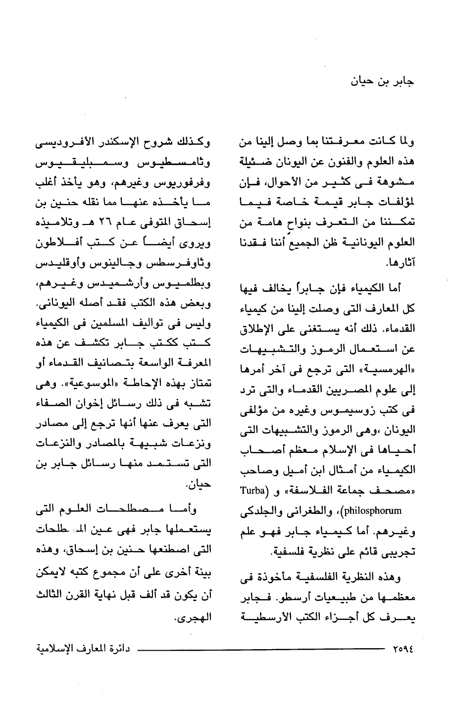 وأما مصطلحات العلوم التي يستعملها جابر فهي عين المصطلحات التي اصطنعها حنين بن إسحاق، وهذه بينة أخرى على أن مجموع كتبه لا يمكن أن يكون قد ألف قبل نهاية القرن الثالث الهجرى.