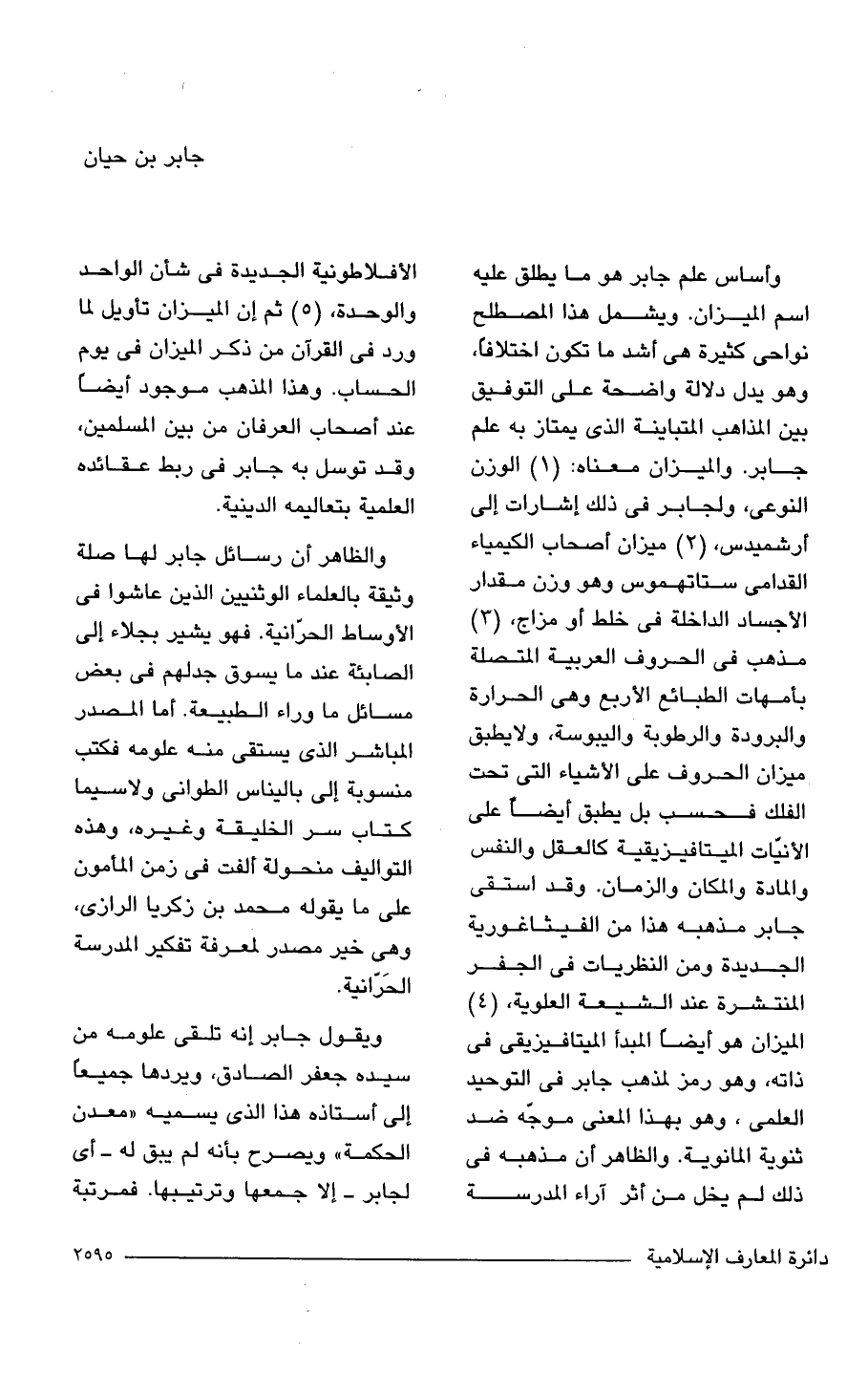 وأساس علم جابر هو ما يطلق عليه اسم الميزان. ويشمل هذا المصطلح نواحى كثيرة هي أشد ما تكون اختلافا، وهو يدل دلالة واضحة على التوفيق بين المذاهب المتباينة الذي يمتاز به علم جابر. والميزان معناه: (1) الوزن النوعى، ولجابر في ذلك إشارات إلى أرشميدس، (2) ميزان أصحاب الكيمياء القدامى ستاتهموس وهو وزن مقدار الأجساد خلة في خلط أومزاج، (3) مذهب في الحروف العربية المتصلة بأمهات الطبائع الأربع وهي الحرارة والبرودة والرطوبة واليبوسة، ولايطبق ميزان الحروف على الأشياء التي تحت الفلك فحسب بل يطبق أيضًا على الأنيات الميتافيزيقية كالعقل والنفس والمادة والمكان والزمان. وقد استقى جابر مذهبه هذا من الفيثاغورية الجديدة ومن النظريات في الجفر المنتشوة عند الشيعة العلوية، (4) الميزان هو أيضًا المبدأ الميتافيزيقى في ذاته، وهو رمز لمذهب جابر في التوحيد العلمي، وهو بهذا المعنى موجَه ضد ثنوية المانوية. والظاهر أن مذهبه في ذلك لم يخل من أثر آراء المدرسة الأفلاطونية الجديدة في شأن الواحد والوحدة، (5) ثم إن الميزان تأويل لما ورد في القرآن من ذكر الميزان في يوم الحساب. وهذا المذهب موجود أيضًا عند أصحاب العرفان من بين المسلمين، وقد توسل به جابر في ربط عقائده العلمية بتعاليمه الدينية.