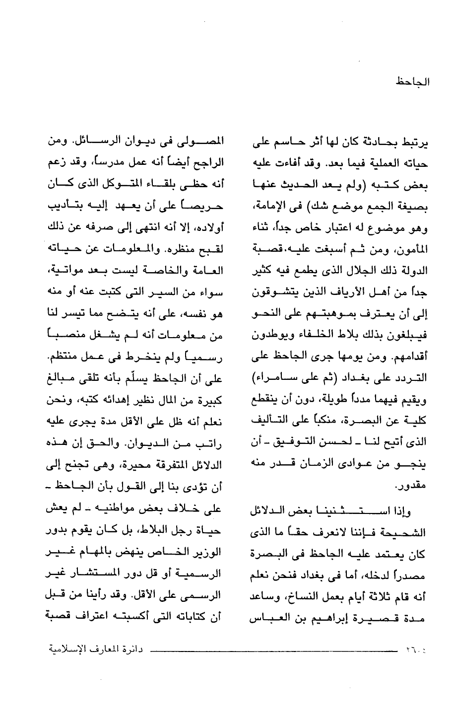 يرتبط بحادثة كان لها أثر حاسم على حياته العملية فيما بعد. وقد أفاءت عليه بعض كتبه (ولم يعد الحديث عنها بصيغة الجمع موضع شك) في الإمامة، وهو موضوع له اعتبار خاص جدًّا، ثناء المأمون، ومن ثم أسبغت عليه. قصبة الدولة ذلك الجلال الذي يطمع فيه كثير جدًّا من أهل الأرياف الذين يتشوقون إلى أن يعترف بموهبتهم على النحو فيبلغون بذلك بلاط الخلفاء ويوطدون أقدامهم. ومن يومها جرى الجاحظ على الترد على بغداد (ثم على سامراء) ويقيم فيهما مددًا طويلة، دون أن ينقطع كلية عن البصرة، منكبا على التأليف الذي أتيح لنا -لحسن التوفيق- أن ينجو من عوادى الزمان قدر منه مقدور.