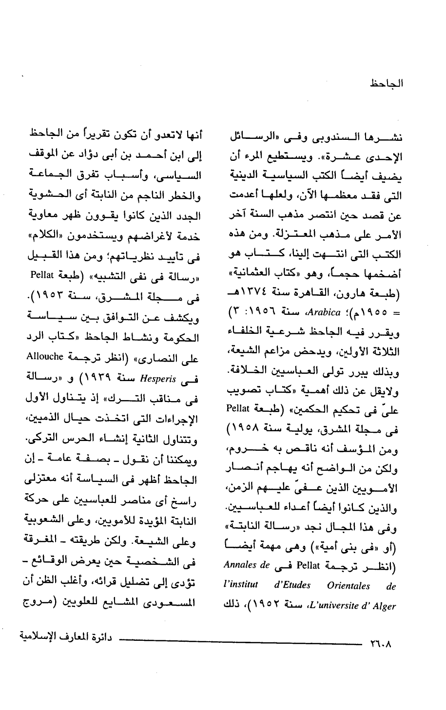 نشرها السندوبى وفي "الرسائل الإحدى عشرة". ويستطيع المرء أن يضيف أيضًا الكتب السياسية الدينية التي فقد معظمها الآن، ولعلها أعدمت عن قصد حين انتصر مذهب السنة آخر الأمر على مذهب المعتزلة. ومن هذه الكتب التي انتهت إلينا، كتاب هو (ضخمها حجما، وهو "كتاب العثمانية" (طبعة هارون، القاهرة سنة 1374 هـ = 1955 م) Arabica " سنة 1956: 3) ويقرر فيه الجاحظ شرعية الخلفاء الثلاثة الأولين، ويدحض مزاعم الشيعة، وبذلك يبرر تولى العباسيين الخلافة. ولا يقل عن ذلك أهمية "كتاب تصويب عليّ في تحكيم الحكمين" (طبعة Pellat في مجلة المشرق، يولية سنة 1958) ومن المؤسف أنه ناقص به خروم، ولكن من الواضح أنه يهاجم أنصار الأمويين الذين عفى عليهم الزمن، والذين كانوا أيضًا أعداء للعباسيين. وفي هذا المجال نجد "رسالة النابتة" (أو "في بني أمية") وهي مهمة أيضًا (انظر ترجمة Pellat في Annales de institut d'Etudes Orientales de , L'universite d' Alger، سنة 1952)، ذلك أنها لا تعدو أن تكون تقريرًا من الجاحظ إلى ابن أحمد بن أبي دؤاد عن الموقف السياسي، وأسباب تفرق الجماعة والخطر الناجم من النابتة أي الحشوية الجدد الذين كانوا يقوون ظهر معاوية خدمة لأغراضهم ويستخدمون "الكلام" في تأييد نظرياتهم؛ ومن هذا القبيل "رسالة في نفى التشبيه" (طبعة Pellat في مجلة المشرق، سنة 1953). ويكشف عن التوافق بين سياسة الحكومة ونشاط الجاحظ "كتاب الرد على النصارى" (انظر ترجمة Allouche في Hesperis سنة 1939) ورسالة في مناقب الترك" إذ يتناول الأول الإجراءات التي اتخذت حيال الذميين، وتتناول الثانية إنشاء الحرس التركى. ويمكننا أن نقول -بصفة عامة- إن الجاحظ أظهر في السياسة أنه معتزلى راسخ أي مناصر للعباسيين على حركة النابتة المؤيدة للأمويين، وعلى الشعوبية وعلى الشيعة. ولكن طريقته -المغرقة في الشخصية حين يعرض الوقائع- تؤدى إلى تضليل قرائه، وأغلب الظن أن المسعودى المشايع للعلويين (مروج