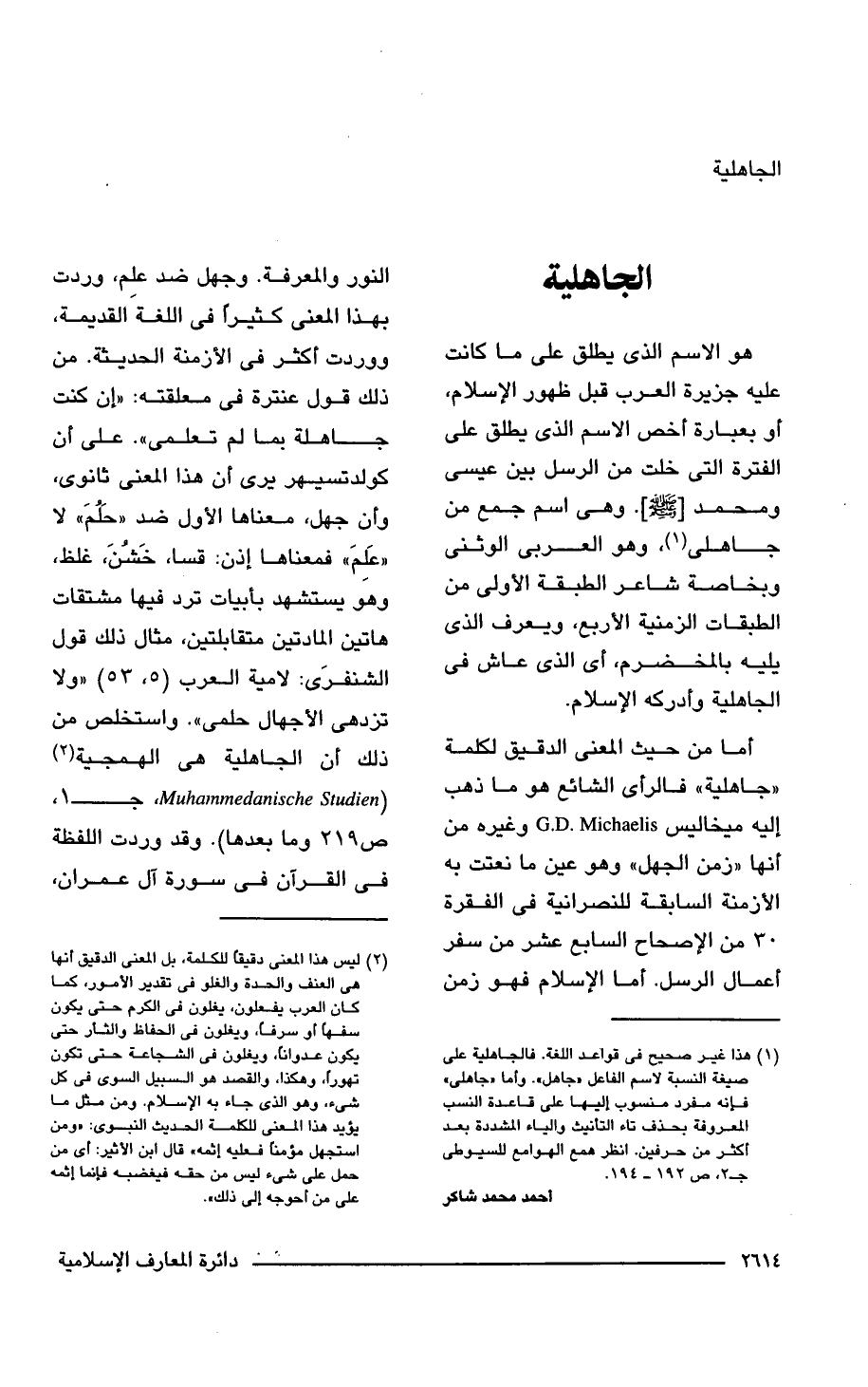 أما من حيث المعنى الدقيق لكلمة "جاهلية" فالرأى الشائع هو ما ذهب إليه ميخاليس G.D. Michaelis وغيره من أنها "زمن الجهل" وهو عين ما نعتت به الأزمنة السابقة للنصرانية في الفقرة 30 من الإصحاح السابع عشر من سفر أعمال الرسل. أما الإسلام فهو زمن النور والمعرفة. وجهل ضد علم، وردت بهذا المعنى كثيرًا في اللغةَ القديمة، وردت أكثر في الأزمنة الحديثة. من ذلك قول عنترة في معلقته: "إن كنت جاهلة بما لم تعلمى". على أن كولدتسيهر يرى أن هذا المعنى ثانوى، وأن جهل، معناها الأول ضد "حَلُمَ" لا "عَلِمَ" فمعناها إذن: قسا، خَشئنَ، غلظ، وهو يستشهد بأبيات ترد فيها مشتقات هاتين المادتين متقابلتين، مثال ذلك قول الشنفرَى: لامية العرب (5، 53) "ولا تزدهى الأجهال حلمى". واستخلص من ذلك أن الجاهلية هي الهمجية (¬2) , Muhammedanische Studien, ج 1، ص 219 وما بعدها). وقد وردت اللفظة في القرآن في سورة آل عمران،