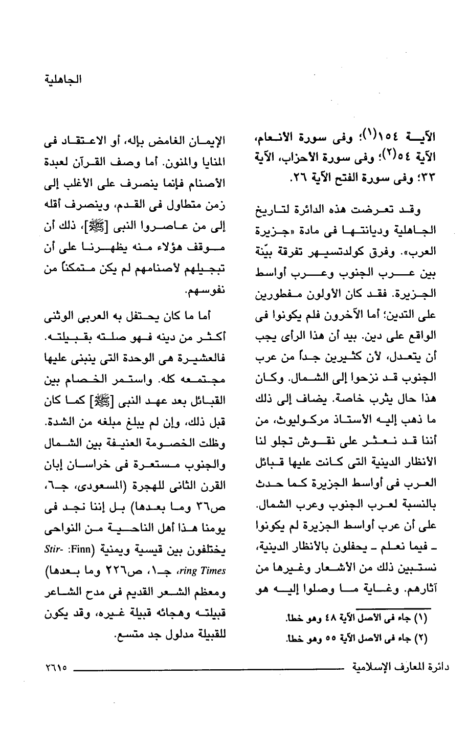 وقد تعرضت هذه الدائرة لتاريخ الجاهلية وديانتها في مادة "جزيرة العرب". وفرق كولدتسيهر تفرقة بئية بين عرب الجنوب وعرب أواسط الجزيرة. فقد كان الأولون مفطورين على التدين؛ أما الآخرون فلم يكونوا في الواقع على دين. بيد أن هذا الرأى يجب أن يتعدل، لأن كثيرين جد، من عرب الجنوب قد نزحوا إلى الشمال. وكان هذا حال يثرب خاصة. يضاف إلى ذلك ما ذهب إليه الأستاذ مركوليوث، من أننا قد نعثر على نقوش تجلو لنا الأنظار الدينية التي كانت عليها قبائل العرب في أواسط الجزيرة كما حدث بالنسبة لعرب الجنوب وعرب الشمال. على أن عرب أواسط الجزيرة لم يكونوا -فيما نعلم- يحفلون بالأنظار الدينية، نستبين ذلك من الأشعار وغيرها من آثارهم. وغاية ما وصلوا إليه هو الإيمان الغامض بإله، أو الاعتقاد في المنايا والمنون. أما وصف القرآن لعبدة الأصنام فإنما ينصرف على الأغلب إلى زمن متطاول في القدم، وينصرف أقله إلى من عاصروا النبي {- صلى الله عليه وسلم -}، ذلك أن موقف هؤلاء منه يظهرنا على أن تبجيلهم لأصنامهم لم يكن متمكنا من نفوسهم.