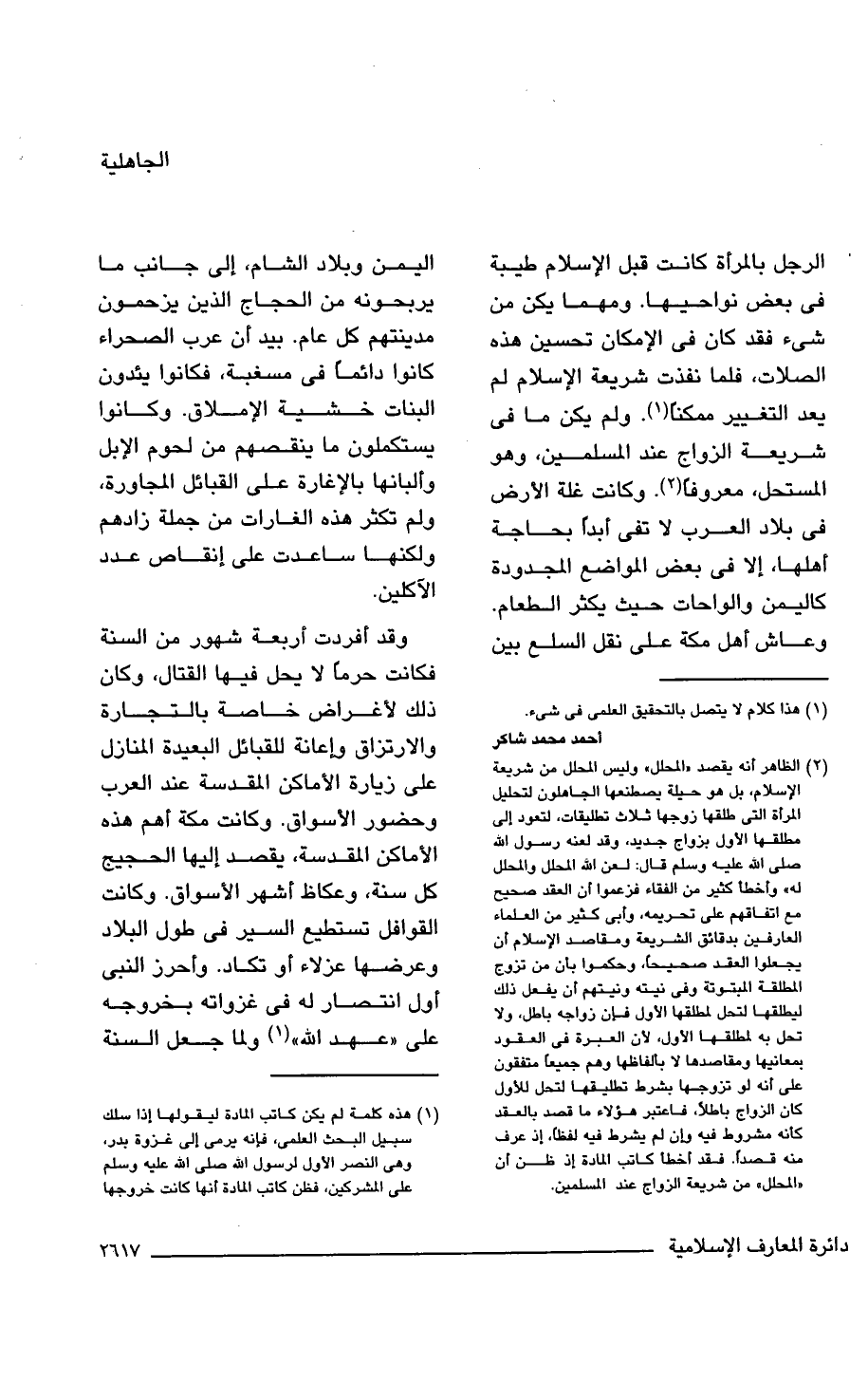 (¬2) الظاهر أنه يقصد "المحلل" وليس المحلل من شريعة الإسلام، بل هو حيلة يصطنعها الجاهلون لتحليل المرأة التي طلقها زوجها ثلاث تطليقات، لتعود إلى مطلقها الأول بزواج جديد، وقد لعنه رسول الله صلى الله عليه وسلم قال: لعن الله المحلل والمحلل له" وأخطأ كثير من الفقاء فزعموا أن العقد صحيح مع اتفاقهم على تحريمه، وأبي كثير من العلماء العارفين بدقائق الشريعة ومقاصد الإسلام أن يجعلوا العقد صحيحا، وحكموا بأن من تزوج المطلقة المبتوتة وفي نيته ونيتهم أن يفعل ذلك ليطلقها لتحل لمطلقها الأول فإن زواجه باطل، ولا تحل به لمطلقها الأول، لأن العبرة في العقود بمعانيها ومقاصدها لا بالفاظها وهم جميعا متفقون على أنه لو تزوجها بشرط تطليقها لتحل للأول كان الزواج باطلًا، فاعتبر هؤلاء ما قصد بالعقد كأنه مشروط فيه وإن لم يشرط فيه لفظًا، إذ عرف منه قصدا. فقد أخطأ كاتب المادة إذ ظن أن "المحلل" من شريعة الزواج عند المسلمين.