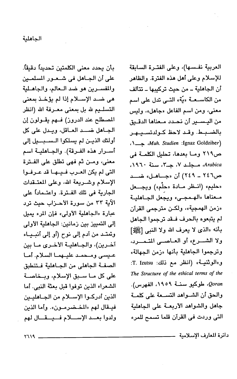 العربية نفسها)، وعلى الفترة السابقة للإسلام وعلى أهل هذه الفترة. والظاهر أن الجاهلية -من حيث تركيبها- تتألف من الكاسعة "يّة" التي تدل على اسم معنى، ومن اسم الفاعل "جاهل"، وليس من اليسير أن نحدد معناها الدقيق بالضبط. وقد لاحظ كولدتسيهر (Muh. Studien: Ignaz Goldziher, ج 1، ص 219 وما بعدها، تحليل الكلمة في o Arabica مجلد 7، ج 3، سنة 1960. ص 246 - 149) أن "جاهل" ضد "حليم" (انظر مادة "حلْم") ويجعل معناها "الهمجى" ويجَعل الجاهلية "زمن الهمجية"، ولكن مترجمى القرآن لم يتبعوه بالحرف فقد ترجموا الجاهل بأنه "الذي لا يعرف الله ولا النبي {- صلى الله عليه وسلم -} ولا الشرع" أو العاصى المتمرد، وترجموا الجاهلية بأنها "زمن الجهالة" و"الوثنية" (انظر مع ذلك: T. Izutsu: the Structure of the ethical terms of the Qoran، طوكيو سنة 1959، الفهرس). والحق أن الشواهد التسعة على كلمة جاهل والشواهد الأربعة على الجاهلية التي وردت في القرآن قلما تسمح للمرء بأن يحدد معنى الكلمتين تحديدًا دقيقًا. على أن الجاهل في شعور المسلمين والمفسرين هو ضد العالم، والجاهلية هي ضد الإسلام إذا لم يؤخذ بمعنى التسليم لله بل بمعنى معرفة الله (انظر المصطلح عند الدروز) فهم يقولون إن الجاهل ضد العاقل، ويدل على كل أولئك الذين لم يسلكوا السبيل إلى أسرار هذه الفرقة). والجاهلية اسم معنى، ومن ثم فهي تطلق على الفترة التي لم يكن العرب فيها قد عرفوا الإسلام وشريعة الله، وعلى المعتقدات الجارية في تلك الفترة. واعتماد، على الآية 33 من سورة الأحزاب حيث ترد عبارة "الجاهلية الأولى" فإن المرء يميل إلى التمييز بين زمانين: الجاهلية الأولى وتمتد من آدم إلى نوح (أو إلى أنبياء آخرين)، والجاهلية الأخرى ما بين عيسى ومحمد عليهما السلام. أما الصفة الجاهلى من الجاهلية فتنطبق على كل ما سبق الإسلام، وبخاصة الشعراء الذين توفوا قبل بعثة النبي. أما الذين أدركوا الإسلام من الجاهليين فيقال لهم "المخضرمون". وأما الذين ولدوا بعد الإسلام فيقال لهم