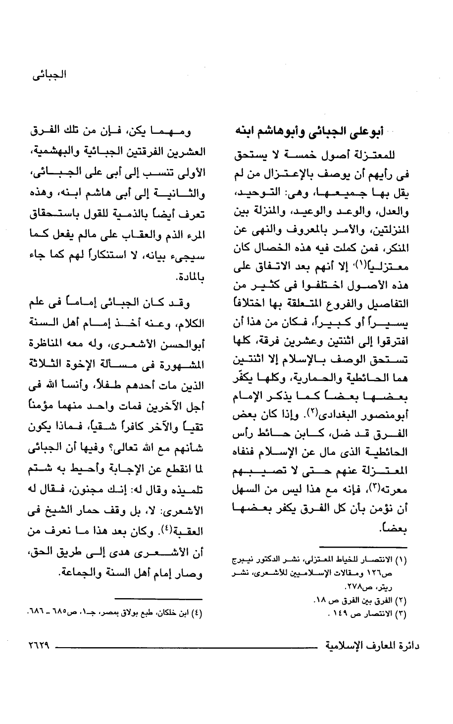 وقد كان الجبائى إمامًا في علم الكلام، وعنه أخذ إمام أهل السنة أبو الحسن الأشعرى، وله معه المناظرة المشهورة في مسألة الإخوة الثلاثة الذين مات أحدهم طفاو، وأنسا الله في أجل الآخرين فمات واحد منهما مؤمنًا تقيا والآخر كافرًا، شقيًا، فماذا يكون شأنهم مع الده تعالى؛ وفيها أن الجبائى لما انقطع عن الإجابة وأحيط به شتم تلميذه وقال له: إنك مجنون، فقال له الأشعرى: لا، بل وقف حمار الشيخ في العقبة (¬4). وكان بعد هذا ما نعرف من أن الأشعرى هدى إلى طريق الحق، وصار إمام أهل السنة والجماعة.