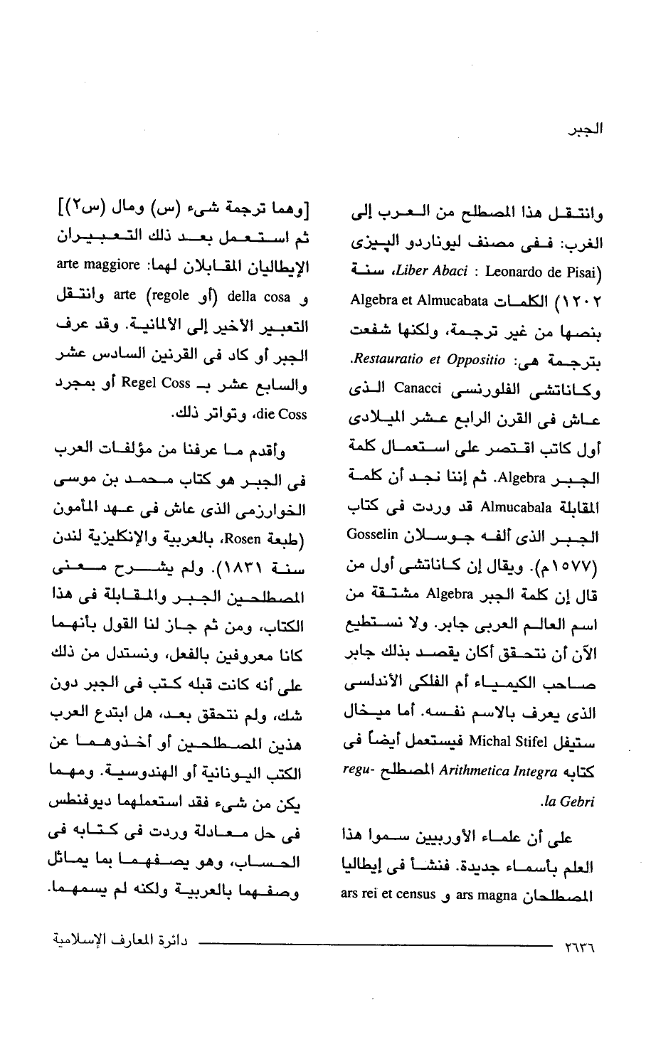 على أن علماء الأوربيين سموا هذا العلم بأسماء جديدة. فنشأ في إيطاليا المصطلحان ars rei et census j ars magna [وهما ترجمة شيء (س) ومال (س 2)] ثم استعمل بعد ذلك التعبيران الإيطاليان المقابلان لهما: maggiore arte و art (regole) della cosa وانتقل التعبير الأخير إلى الألمانية. وقد عرف الجبر أو كاد في القرنين السادس عشر والسابع عشر بـ Regel Coss أو بمجرد die Coss. وتواتر ذلك.