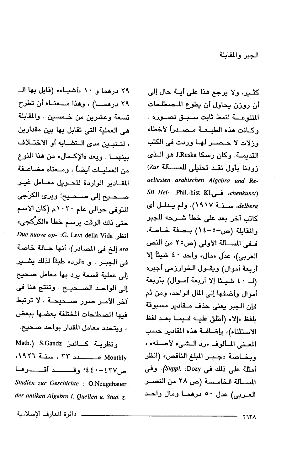 كثير، ولا يرجع هذا على آية إلى أن روزن يحاول أن يطوع المصطلحات المتنوعة لنمط ثابت سبق تصوره. وكانت هذه الطبعة مصدرلم لأخطاء وزلات لا حصر لها وردت في الكتب القديمة. وكان رسكا J. Rucka هو الذي زودنا بأول نقد تحليلى للمسألة Zur) -aeltesten arabischen Algebra and Re (chenkunst، في Kl. SB Hei-: Phil.-hist delberg، سنة 1917). ولم يدلل أي كاتب آخر بعد على خطأ شرحه للجبر والمقابلة (ص -5 - 14) بصفة خاصة. ففي المسألة الأولى (ص 25 من النص العربي)، عدَل "مال" واحد 40 شيئًا إلا أربعة أموال) ويقول الخوارزمى أجبره (لـ 40 شيئًا إلا أربعة أموال) بأربعة أموال وأضفها إلى المال الواحد، ومن ثم فإن الجبر يعني حذف مقادير مسبوقة بلفظ "إلا" أطلق عليه فيما بعد لفظ الاستثناء)، بإضافة هذه المقادير حسب المعنى المالوف "رد الشيء لأصله"، وبخاصة لاجبر المبلغ الناقص" (انظر أمثلة على ذلك في Suppl.: Dozy). وفي المسألة الخامسة (ص 28 من النصر العربي) عدل 50 درهما ومال واحد 29 درهما و 10 "أشياء" (قابل بها إلى 29 درهما)، وهذا معناه أن تطرح تسعة وعشرين من خمسين. والمقابلة هي العملية التي تقابل بها بين مقدارين، لتتبين مدى التشابه أو الاختلاف بينهما. ويعد "الإكمال" من هذا النوع من العمليات أيضًا، ومعناه مضاعفة المقادير الواردة لتحويل معامل غير صحيح إلى صحيح" ويرى الكرَجى المتوفى حوالي عام 1030 م (كان الاسم حتى ذلك الوقت يرسم خطا "الكرْكجى" انظر. Levi della Vida Due nuove op: G. era إلخ في المصادر)، أنها حالة خاصة في الجبر. و"الرد" طبقا لذلك يشير إلى عملية قسمة يرد بها معامل صحيح إلى الواحد الصحيح. وتنتج هنا في آخر الأمر صور صحيحة، لا ترتبط فيها المصطلحات المختلفة بعضها ببعض، ويتحدد معامل المقدار بواحد صحيح.