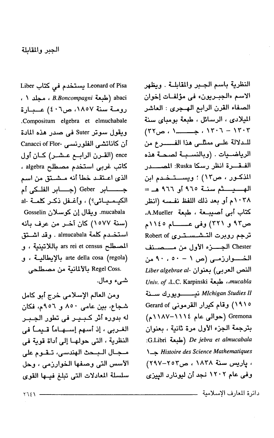 النظرية باسم الجبر والمقابلة. ويظهر الاسم "الجبريون" في مؤلفات إخوان الصفاء القرن الرابع الهجرى: العاشر الميلادي، الرسائل، طبعة بومباى سنة 1303 - 1306 , ج 1، ص 32) للدلالة على ممثلى هذا الفرع من الرياضيات. (وبالنسبة لصحة هذه الفقرة انظر رسكا Ruska: المصدر المذكور، ص 13) ويستخدم ابن الهيثم سنة 965 أو 966 هـ = 1038 م أو بعد ذلك اللفظ نفسه (انظر كتاب أبي أصيبعة، طبعة A.Mueller. ص 93 و 321) في عام 1145 م ترجم روبرت التشسترى Robert of Chester الجزء الأول من مصنف الخوارزمى (ص 1 - 50، 90 من النص العربي) بعنوان - Liber algebrae al mucabla, طبعة Karpinski C. L. Univ. of II Michigan Studies نيويورك سنة 1915) وقام كيرار القرمونى Gerard Gremona) حوالي عام 1114 - 1187 م) بترجمة الجزء الأول مرة ثانية، بعنوان De jebra et almucabala (طبعة: G.Libri Histoire des Science Mathematiques ج 1، باريس سنة 1838، ص 253 - 297) وفي عام 1202 نجد أن ليونارد البيزى Leonard of Pisa يستخدم في كتاب abaci (طبعة B.Boncompagni، مجلد 1، رومة سنة 1857، ص 406) عبارة Compositum elgebra et elmuchabale. ويقول سوتر Suter في صدر هذه المادة أن كاناتشى الفلورنسى - Canacci of Flor ence) القرن الرابع عشر) كان أول كاتب غربي استخدم مصطلح algebra، الذي اعتقد خطأ أنه مشتق من اسم جابر Cipher) جابر الفلكى أم الكيميائى؟ )، وأغفل ذكر كلمة - al a mucabala . ويقال إن كوسلان (سنة 1577) كان اخر من عرف بأنه استخدم كلمة al mucahala . وقد اشتق المصطلح arc rei et census باللاتينية، و (arte della cosa (regola بالإيطالية، و. Regel Coss بالألمانية من مصطلحى شيء ومال.