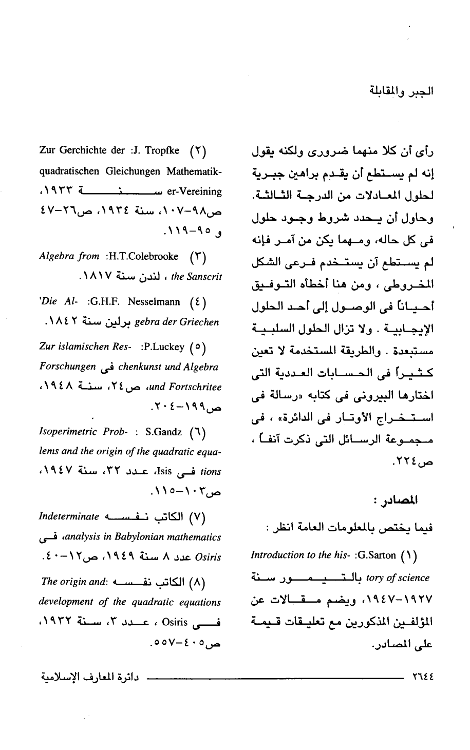 (8) الكاتب نفسه the origin and development of the quadratic equations في Osiris , , عدد 3، سنة 1932 ص 405 - 557.