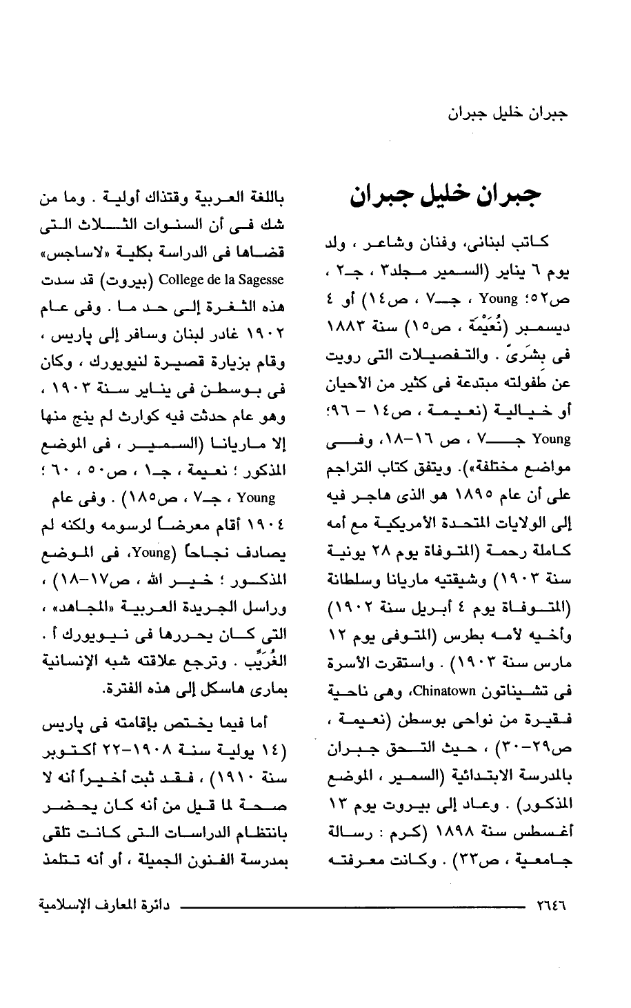 كاتب لبنانى، وفنان وشاعر، ولد يوم 6 يناير (السمير مجلد 3، ج 2، ص 52؛ Young, ج 7، ص 14) أو 4 ديسمبر (نُعَيمَة، ص 15) سنة 1883 في بشَريّ. والتفصيلات التي رويت عن طَفولته مبتدعة في كثير من الأحيان أو خيالية (نعيمة، ص 14 - 96، Young ب 7، ص 16 - 18، وفي مواضع مختلفة"). ويتفق كتاب التراجم على أن عام 1895 هو الذي هاجر فيه إلى الولايات المتحدة الأمريكية مع أمه كاملة رحمة (المتوفاة يوم 28 يونية سنة 1903) وشيقتيه ماريانا وسلطانة (المتوفاة يوم 4 أبريل سنة 1902) وأخيه لأمه بطرس (المتوفى يوم 12 مارس سنة 1903). واستقرت الأسرة في تشيناتون Chinatown هي ناحية فقيرة من نواحى بوسطن (نعيمة، ص 29 - 30)، حيث التحق جبران بالمدرسة الابتدائية (السمير، الموضع المذكور). وعاد إلى بيروت يوم 13 أغسطس سنة 1898 (كرم: رسالة جامعية، ص 33). وكانت معرفته باللغة العربية وقتذاك أولية. وما من شك في أن السنوات الثلاث التي قضاها في الدراسة بكلية "لاساجس" College de la Sagesse (بيروت) قد سدت هذه الثغرة إلى حد ما. وفي عام 1902 غادر لبنان وسافر إلى باريس، وقام بزيارة قصيرة لنيويورك، وكان في بوسطن في يناير سنة 1903، وهو عام حدثت فيه كوارث لم ينج منها إلا ماريانا (السمير، في الموضع المذكور! نعيمة، ج 1، ص 50، 60؛ Young, ج 7، ص 185). وفي عام 1904 أقام معرضا لرسومه ولكنه لم يصادف نجاحا (Young, في الموضع المذكور؟ خير الله، ص 17 - 18)، وراسل الجريدة العربية "المجاهد"، التي كان يحررها في نيويورك أ. الغُرَيب. وترجع علاقته شبه الإنسانية بمارى هاسكل إلى هذه الفترة.