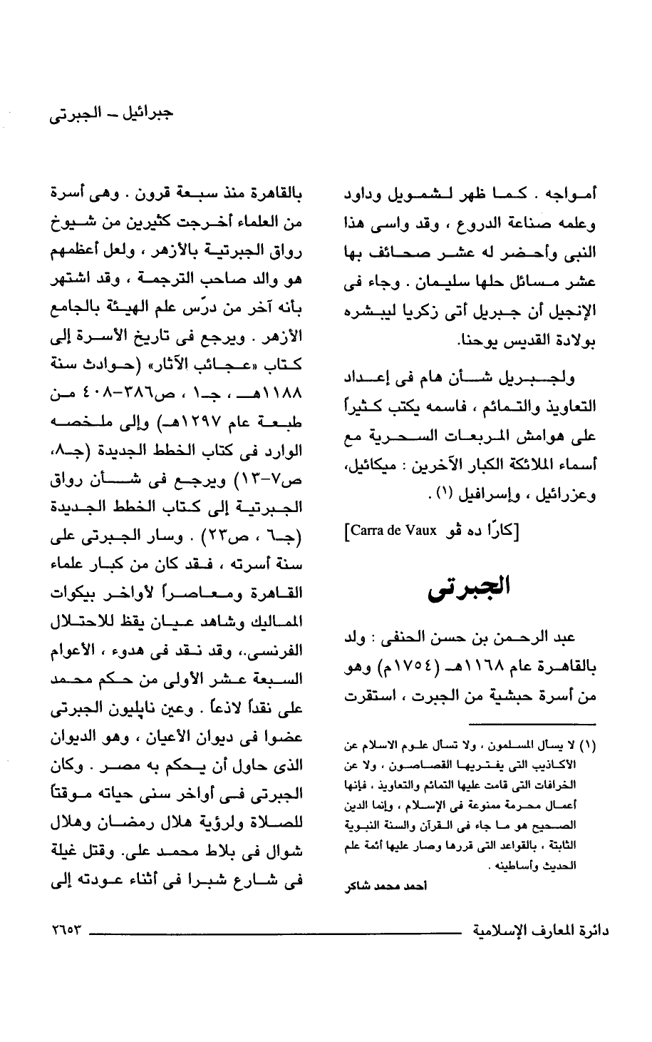 عبد الرحمن بن حسن الحنفي: ولد بالقاهرة عام 1168. (1754) وهو من أسرة حبشية من الجبرت، استقرت بالقاهرة منذ سبعة قرون. وهي أسرة من العلماء أخرجت كثيرين من شيوخ رواق الجبرتية بالأزهر، ولعل أعظمهم هو والد صاحب الترجمة، وقد اشتهر بأنه آخر من درس علم الهيئة بالجامع الأزهر. ويرجع في تاريخ الأسرة إلى كتاب "عجائب الآثار" (حوادث سنة 1188 هـ، ج 1، ص 386 - 408 من طبعة عام 1297 هـ) وإلى ملخصه الوارد في كتاب الخطط الجديدة (ب 8، ص 7 - 13) ويرجع في شأن رواق الجبرتية إلى كتاب الخطط الجديدة (ج 6، ص 23). وسار الجبرتى على سنة أسرته، فقد كان من كبار علماء القاهرة ومعاصرًا لأواخر بيكوات المماليك وشاهد عيان يقظ للاحتلال الفرنسى.، وقد نقد في هدوء، الأعوام السبعة عشر الأولى من حكم محمد على نقدًا لاذعًا. وعين نابليون الجبرتى عضوا في ديوان الأعيان، وهو الديوان الذي حاول أن يحكم به مصر. وكان الجبرتى في أواخر سنى حياته موقتًا للصلاة ولرؤية هلال رمضان وهلال شوال في بلاط محمد على. وقتل غيلة في شارع شبرًا في أثناء عودته إلى