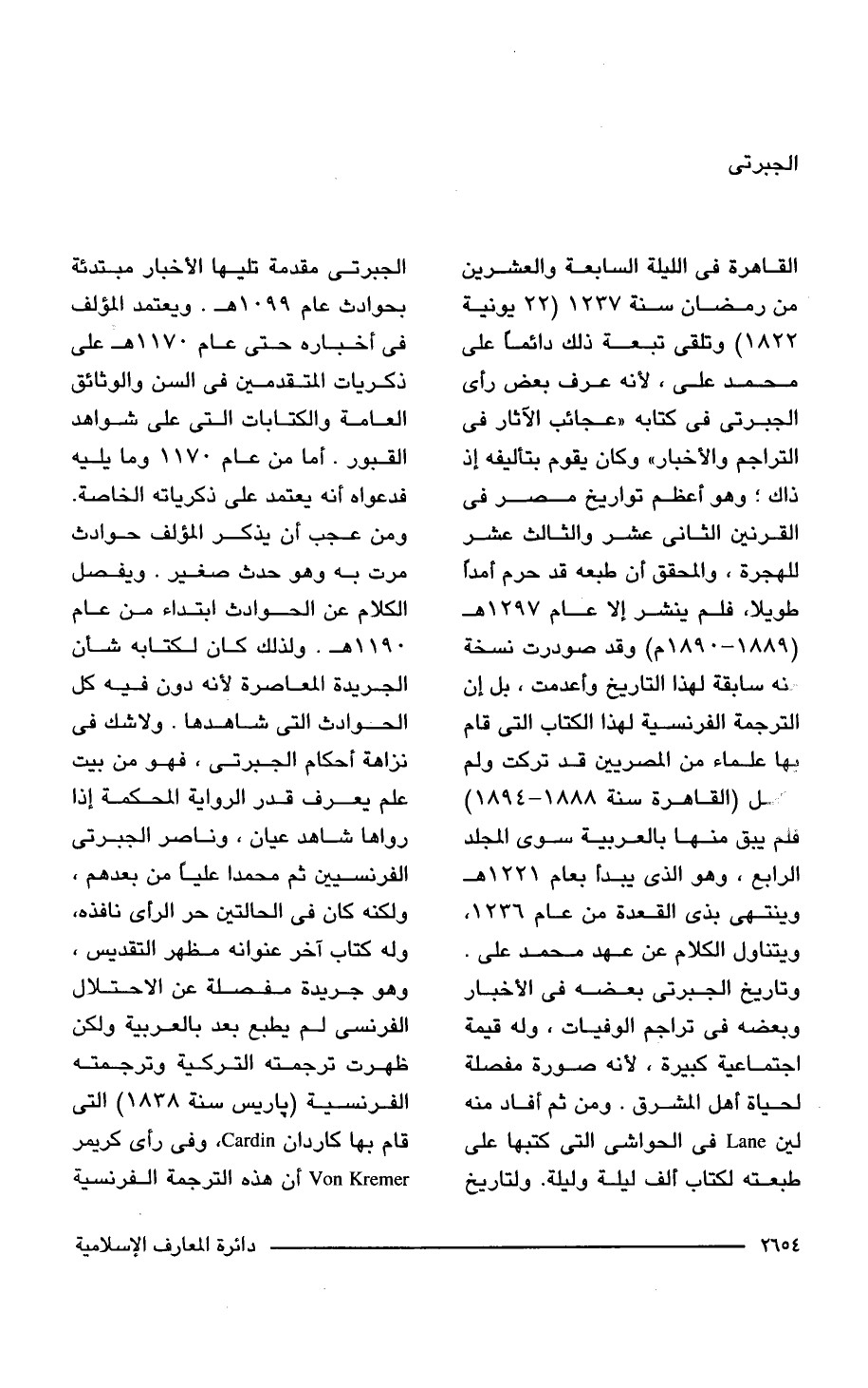 القاهرة في الليلة السابعة والعشرين من رمضان سنة 1237 (22 يونية 1822) وتلقى تبعة ذلك دائمًا على محمد على، لأنه عرف بعض رأى الجبرتى في كتابه "عجائب الآثار في التراجم والأخبار" كان يقوم بتأليفه إذ ذاك؛ وهو أعظم تواريخ مصر في القرنين الثاني عشر والثالث عشر للهجرة، والمحقق أن طبعه قد حرم أمدًا طويلًا، فلم ينشر إلا عام 1297 هـ (1889 - 1890 م) وقد صودرت نسخة منه سابقة لهذا التاريخ وأعدمت، بل إن الترجمة الفرنسية لهذا الكتاب التي قام بها علماء من المصريين قد تركت ولم تصل (القاهرة سنة 1888 - 1894) هلم يبق منها بالعربية سوى المجلد الرابع، وهو الذي يبدأ بعام 1221 هـ وينتهى بذى القعدة من عام 1236، ويتناول الكلام عن عهد محمد على. وتاريخ الجبرتى بعضه في الأخبار وبعضه في تراجم الوفيات، وله قيمة اجتماعية كبيرة، لأنه صورة مفصلة لحياة أهل المشرق. ومن ثم أفاد منه لين Lane في الحواشى التي كتبها على طبعته لكتاب ألف ليلة وليلة. ولتاريخ الجبرتى مقدمة تليها الأخبار مبتدئة بحوادث عام 1099 هـ. ويعتمد المؤلف في أخباره حتى عام 1170 هـ -على ذكريات المتقدمين في السن والوثائق العامة والكتابات التي على شواهد القبور. أما من عام 1170 وما يليه فدعواه أنه يعتمد على ذكرياته الخاصة. ومن عجب أن يذكر المؤلف حوادث مرت به وهو حدث صغير. ويفصل الكلام عن الحوادث ابتداء من عام 1190 هـ. ولذلك كان لكتابه شأن الجريدة المعاصرة لأنه دون فيه كل الحوادث التي شاهدها. ولا شك في نزاهة أحكام الجبرتى، فهو من بيت علم يعرف قدر الرواية المحكمة إذا رواها شاهد عيان، وناصر الجبرتى الفرنسيين ثم محمدًا عليًّا من بعدهم، ولكنه كان في الحالتين حر الرأى نافذه، وله كتاب آخر عنوانه مظهر التقديس، وهو جريدة مفصلة عن الاحتلال الفرنسى لم يطبع بعد بالعربية ولكن ظهرت ترجمته التركية وترجمته الفرنسية (باريس سنة 1838) التي قام بها كاردان Cardin. وفي رأى كريمر Von Kremer أن هذه الترجمة الفرنسية