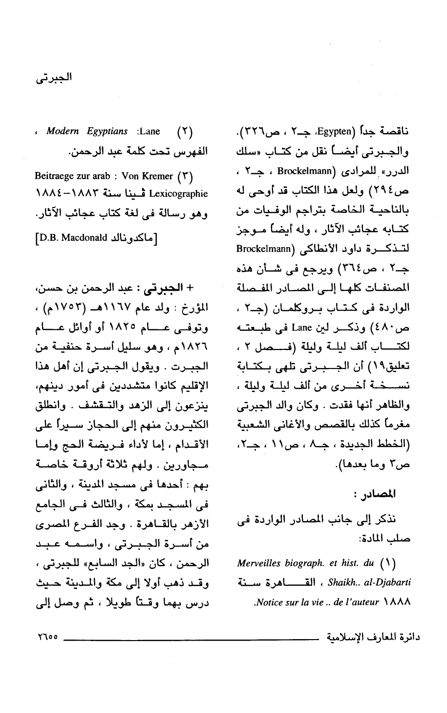 ناقصة جدًّا (Egypten، ج 2، ص 326). والجبرتى أيضًا نقل من كتاب "سلك الدرر" للمرادى (Brockelmann. ج 2، ص 294) ولعل هذا الكتاب قد أوحى له بالناحية الخاصة بتراجم الوفيات من كتابه عجائب الآثار، وله أيضًا موجز لتذكرة داود الأنطاكى (Brockelmann ج 2، ص 364 (ويرجع في شأن هذه المصنفات كلها إلى المصادر المفصلة الواردة في كتاب بروكلمان (ج 2، ص 480) وذكر لين Lane في طبعته لكتاب ألف ليلة وليلة (فصل 2، تعليق 19) أن الجبرتى تلهى بكتابة نسخة أخرى من ألف ليلة وليلة، والظاهر أنها فقدت. وكان والد الجبرتى مغرما كذلك بالقصص والأغانى الشعبية (الخطط الجديدة، ج 8، ص 11، ج 2، ص 3 وما بعدها).