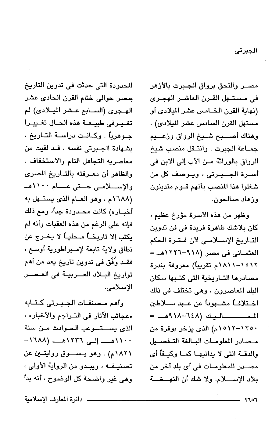 وظهر من هذه الأسرة مؤرخ عظيم، كان بلاشك ظاهرة فريدة في فن تدوين التاريخ الإسلامي لأن فترة الحكم العثمانى في مصر (918 - 1226 هـ = 1512 - 1811 م تقريبًا) معروفة بندرة مصادرها التاريخية التي كتبها سكان البلد المعاصرون، وهي تخللف في ذلك اختلافًا مشهودًا عن عهد سلاطين المماليك (648 - 918 هـ = 1250 - 1512 م) الذي يزخر بوفرة من مصادر المعلومات البالغة التفصيل والدقة التي لا يدانيها كما وكيفا أي مصدر للمعلومات في أي بلد آخر من بلاد الإسلام. ولا شك أن النهضة المحدودة التي حدثت في تدوين التاريخ بمصر حوالي ختام القرن الحادي عشر الهجرى (السابع عشر الميلادي) لم تغيرفى طبيعة هذه الحال تغييرا جوهريا. وكانت دراسة التاريخ، بشهادة الجبرتى نفسه، قد لقيت من معاصريه التجاهل التام والاستخفاف. والظاهر أن معرفته بالتاريخ المصري والإسلامى حتى عام 1100 هـ (1688 م، وهو العام الذي يستهل به أخباره) كانت محدودة جدًّا، ومع ذلك فإنه على الرغم من هذه العقبات وأنه لم يكتب إلا تاريخًا محليًا لا يخرج عن نطاق ولاية تابعة لإمبراطورية أوسع، فقد وُفق في تدوين تاريخ يعد من أهم تواريخ البلاد العربية في العصر الإسلامي.